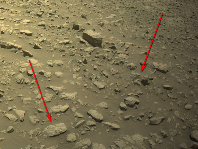 Снимок от 6 янв. 2025 (1380 сол) с привязкой к особенностям местности. Мы видим кормовую часть ровера и холм со вписанными в него камнями - марсоход движется от него.