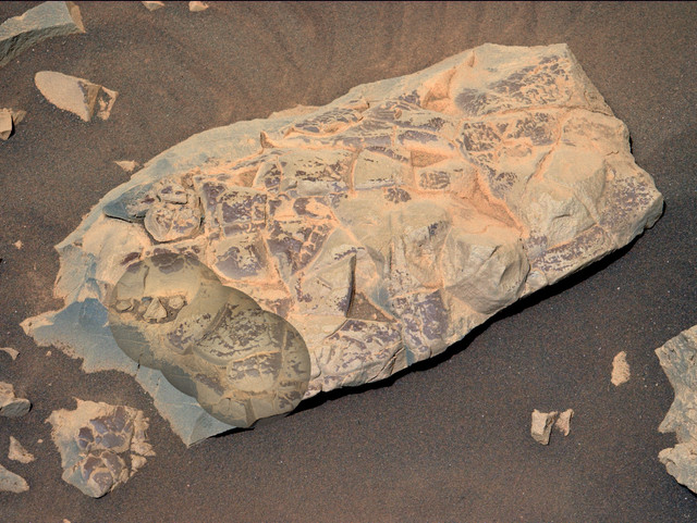 Марсоход НАСА Perseverance сделал это изображение «леопардовых пятен» на камне под названием «Водопад Чеява» 18 июля 2024 года - сол 1212, или 1212-й марсианский день миссии. По всей длине камня тянутся крупные прожилки белого сульфата кальция. Между этими прожилками находятся полосы материала, красноватый цвет которого указывает на присутствие гематита, одного из минералов, придающих Марсу характерный ржавый оттенок. Ученых особенно интересуют миллиметровые светлые пятна неправильной формы на центральной красноватой полосе (слева направо внизу снимка), которые напоминают пятна леопарда. Perseverance сделал снимок с помощью камеры WATSON (Wide Angle Topographic Sensor for Operations and eNgineering), входящей в набор приборов SHERLOC (Scanning Habitable Environments with Raman and Luminescence for Organics and Chemicals), расположенный на конце роботизированной руки Perseverance.