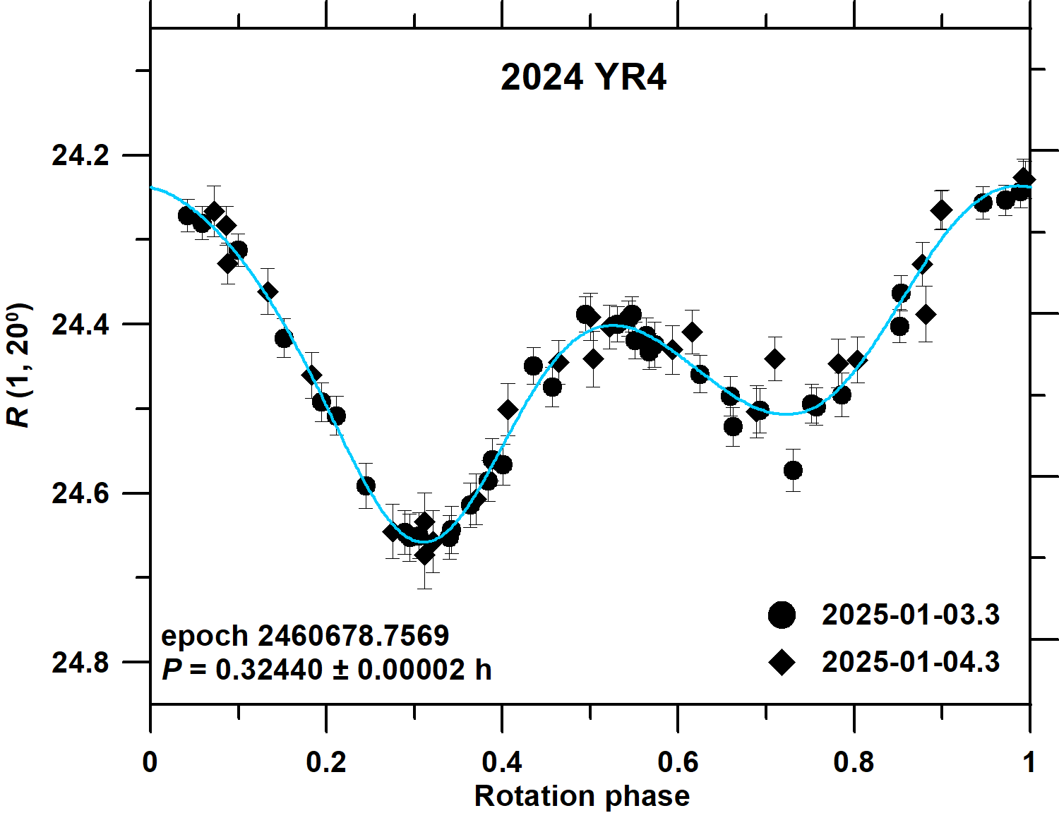 ЦитироватьThe website lists a rotation period of 0.3245 ± 0.0002 h for 2024 YR4, which corresponds to 19.47 ± 0.01 minutes. It also mentions 2024 YR4 has a lightcurve amplitude of 0.42 mag, which corresponds to an equatorial elongation (a/b ratio) of ~1.47. The lightcurve quality code is U=3, so the rotation period here is secure with no ambiguity. The website also gives a single color index of (V - R) = 0.48 ± 0.02 for 2024 YR4.