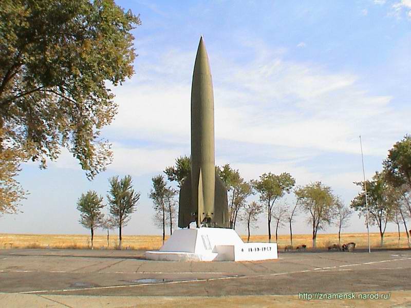 Монумент с моделью ракеты Р-2 был установлен 4 октября 1997 года в честь 40-летия запуска первого искусственного спутника Земли. Ракета Р-2 является одной из первых отечественных управляемых баллистических ракет. Она была создана конструктором Сергеем Королевым в 1948 году по чертежам немецкой ФАУ-2 и имела дальность полета 600 км.