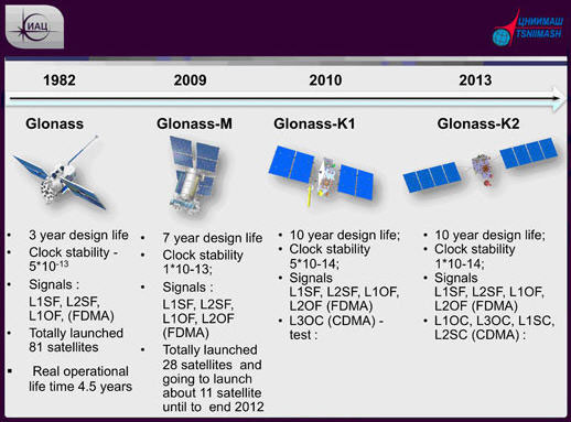 Относительно развития системы, Ревнивых сообщил, что спутник ГЛОНАСС-К будет иметь две версии: ГЛОНАСС-К1 и ГЛОНАСС-К2. Спутник ГЛОНАСС-К1 будет иметь гарантийный срок службы 10 лет, стабильность часов 510-14 и будет запущен в декабре этого года с космодрома «Плесецк», который расположен в 800 км к северу от Москвы. Это будет первый запуск спутника ГЛОНАСС, который пройдет не с Байконура. После этого будет построен и запущен еще один спутник ГЛОНАСС-К1. Эти спутники предназначены для тестирования открытого сервиса CDMA сигнала на частоте ГЛОНАСС L3 (1205 МГц). На вопрос о том, когда будет объявлена спецификация сигнала CDMA, Ревнивых ответил, что он этого не знает.