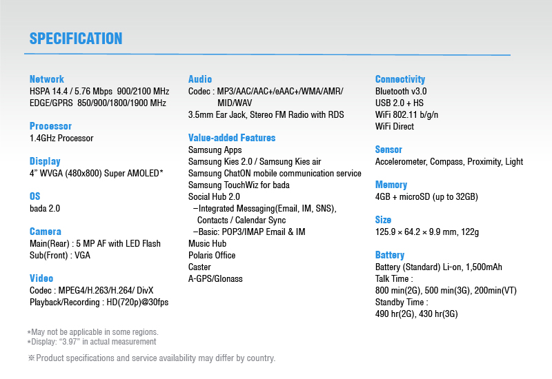 Все три модели работают под управлением новой версии ОС собственной разработки bada 2.0. Среди ее новых возможностей – многозадачность, распознавание речи, технология прямого обмена данными между устройствами по Wi-Fi (альтернатива Bluetooth), опциональная поддержка технологии NFC.