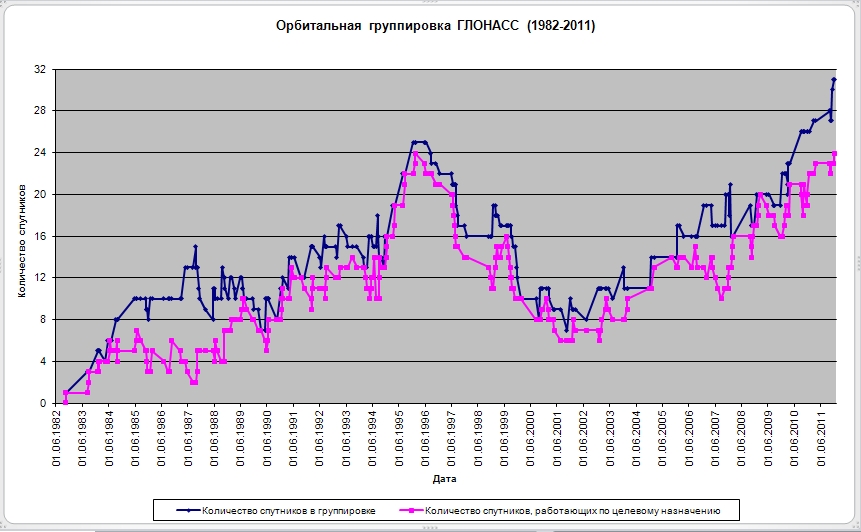 График развертывания орбитальной группировки системы ГЛОНАСС с 1982 по 2011 годы.
