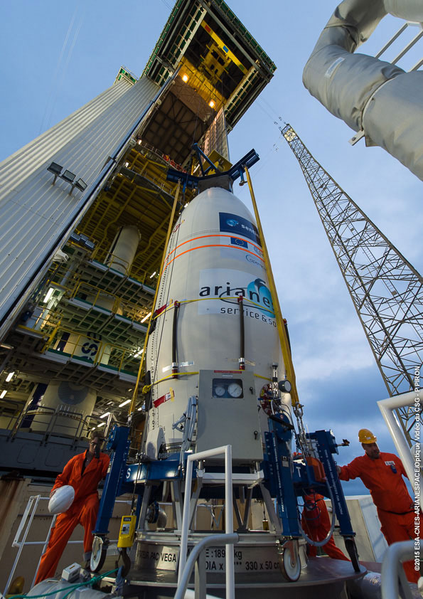 This assembly process concluded with integration of Vega's "upper composite," consisting of Sentinel-2A and its protective payload fairing. Installation took place at the Spaceport's ZLV launch site, inside the facility's protective mobile gantry.