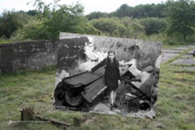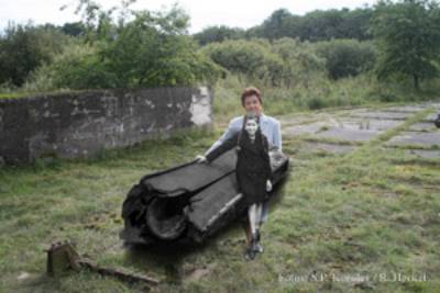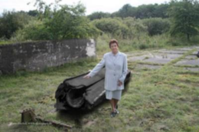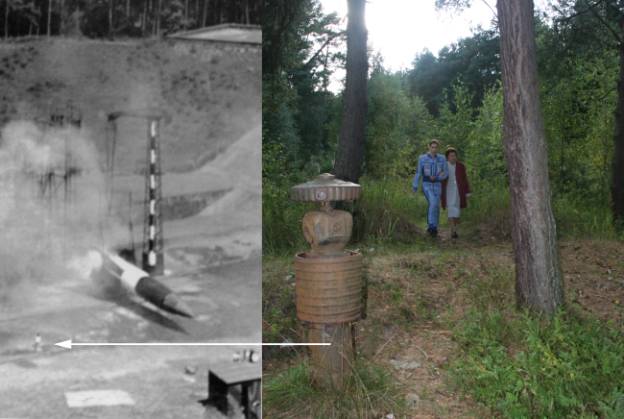 Rests of an old wall and two bolts are the signs: Here was Korolev and mada a picture of his little daghter. This was an old ramp of the V1. You can exactly see: this place is the same. Nothing is chanched at the photomontage. Koroleva is standing at the same place with 62 years destance. Photos: S.P. Korolev and R. Heckel