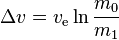 - в английской Википедии Δv=Ve*ln(M0/M1)    где Ve - скорость истечения продуктов  сгорания топлива (effective exhaust velocity)
