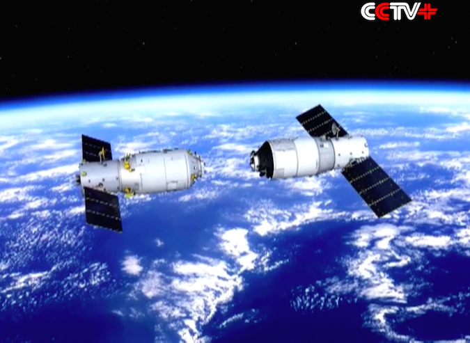 Artist's concept of the Tianzhou 1 and Tiangong 2 spacecraft docking in orbit. Credit: CCTV