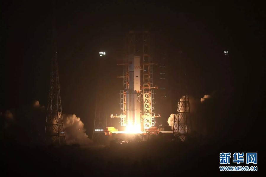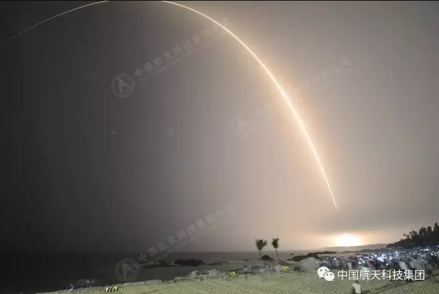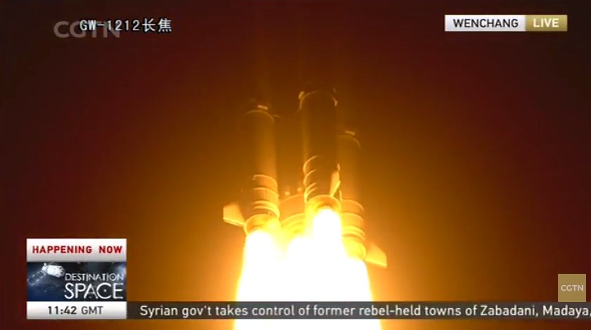 The 174-foot-tall (53-meter) kerosene-fueled launcher blasted off fr om the Wenchang space center, a tropical facility on Hainan Island at China's southern frontier, at 1141:35 GMT (7:41:35 a.m. EDT; 7:41:35 p.m. Beijing time), shortly after sunset at launch site.