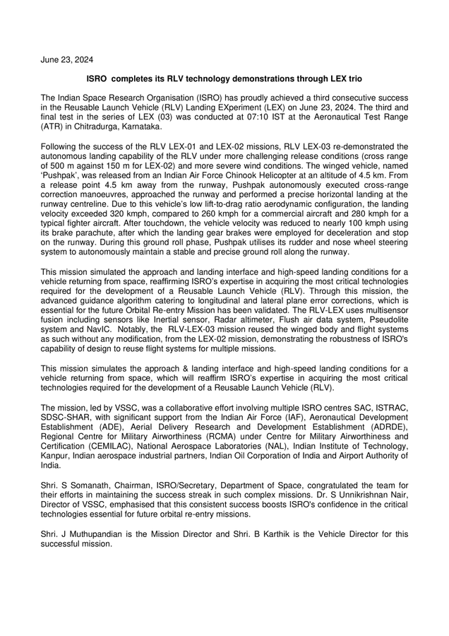 The Indian Space Research Organisation (ISRO) has proudly achieved a third consecutive success in the Reusable Launch Vehicle (RLV) Landing EXperiment (LEX) on June 23, 2024. The third and final test in the series of LEX (03) was conducted at 07:10 IST at the Aeronautical Test Range (ATR) in Chitradurga, Karnataka.