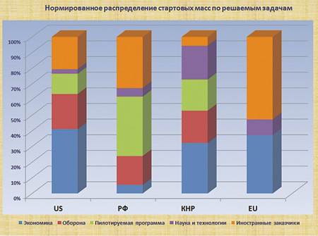 Рассмотрев разные варианты, можно определить достаточно адекватный параметр для оценки объема космической деятельности – суммарную стартовую массу РН. Запуск ракет-носителей в космическое пространство – ключевой элемент космической деятельности. Именно в запуске ракеты сосредоточены все научно-исследовательские, опытно-конструкторские работы, проведение испытаний и производство космической техники. Проведя такое суммирование, можно корректно сравнивать объем космической деятельности за разные периоды в разных странах и по разным целевым направлениям.
