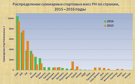 Для 2016 года соответствующие цифры: 83 РН общей массой 49 059 т, 216 КА, принадлежащих 20 странам, три аварийные ракеты-носителя общим весом 1109 т.