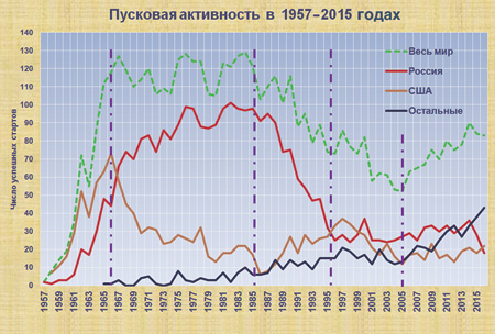 Изменение интенсивности запусков за все время космической эры показано на графике (рис. 1). На этом графике просматриваются основные характерные периоды.