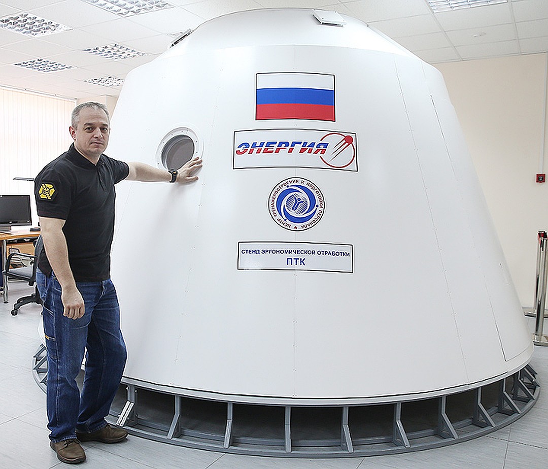 Начальник летно-испытательной службы РКК "Энергия" Марк Серов демонстрирует макет пилотируемого транспортного корабля нового поколения "Федерация" в РКК "Энергия". ФОТО Антон Новодережкин/ТАСС