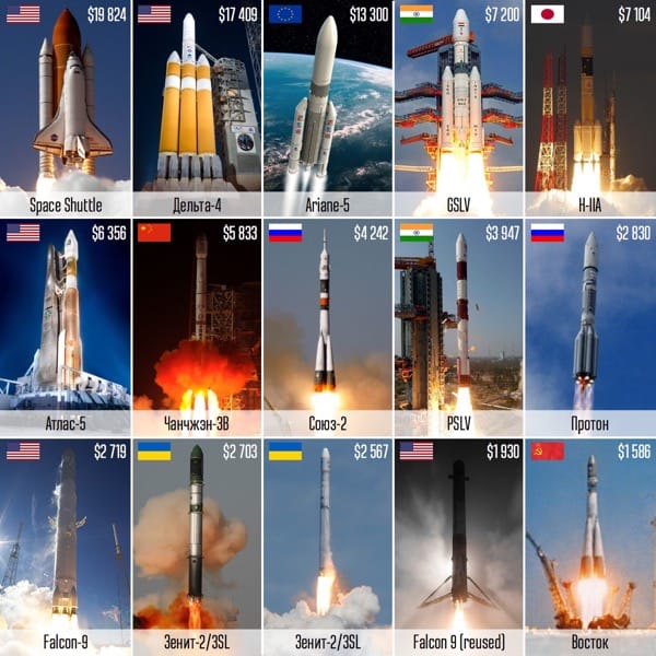 «Примерно», потому что, во-первых, не все из этих ракет сейчас продолжают летать, и, во-вторых, стоимость запуска одного и того же носителя могла существенно меняться со временем.