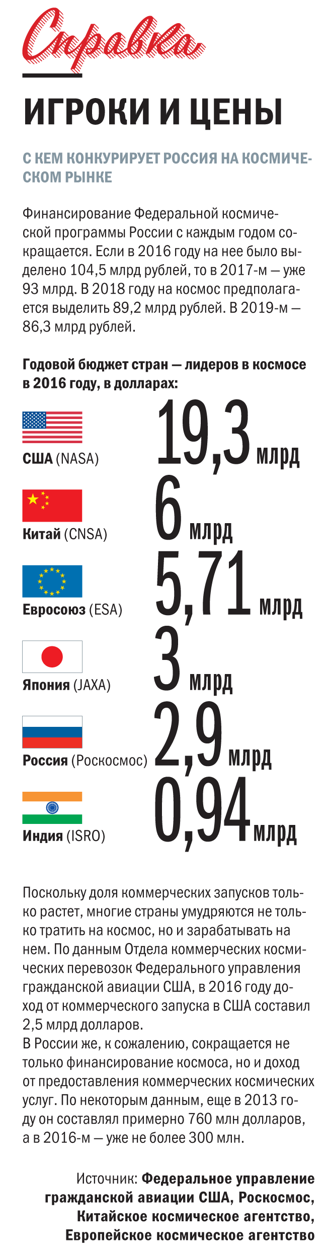 — Наша страна, запустившая в космос первый спутник и первого человека, сегодня осталась на периферии многих космических рынков, в том числе спутникостроения,— говорит эксперт в области космической политики, член-корреспондент Российской академии космонавтики им. К.Э. Циолковского Андрей Ионин.— Но надо понимать, что космическая отрасль в целом сейчас находится в стагнации. И не только у нас в стране. Шестьдесят лет назад запуск первого спутника был достижением не только научно-техническим, но и военно-политическим. Ни Сталин и Трумэн, ни позднее Хрущев и Эйзенхауэр никогда не финансировали ракетно-комические программы ради освоения космоса. Они решали приоритетные национальные задачи, используя космонавтику и даже людскую жажду освоения космоса как эффективные инструменты. Космонавтика стала побочным продуктом создания ракетного оружия. Создание такого стратегического вооружения в наикратчайшие сроки в обеих странах считалось не просто приоритетной задачей, а вопросом жизни и смерти страны. Поэтому проблема финансирования космоса вообще не стояла. Речь шла только о сроках. Потом, на счастье космонавтики, оказалось, что успехи освоения космоса имеют колоссальный общемировой вес, наглядно доказывая превосходство социально-экономического строя. Вопрос финансирования тоже был вторичным. Так мировая космонавтика, опираясь на соревнования двух сверхдержав, прожила еще 20 "счастливых лет", не думая о деньгах. Сегодня этого нет и в помине. Как нет и ответа на вопрос, зачем нам сегодня космос. Ответа нет не только в России. Попытки дважды войти в одну и ту же реку, закрутив новую космическую гонку между США и Китаем, пока неудачны.
