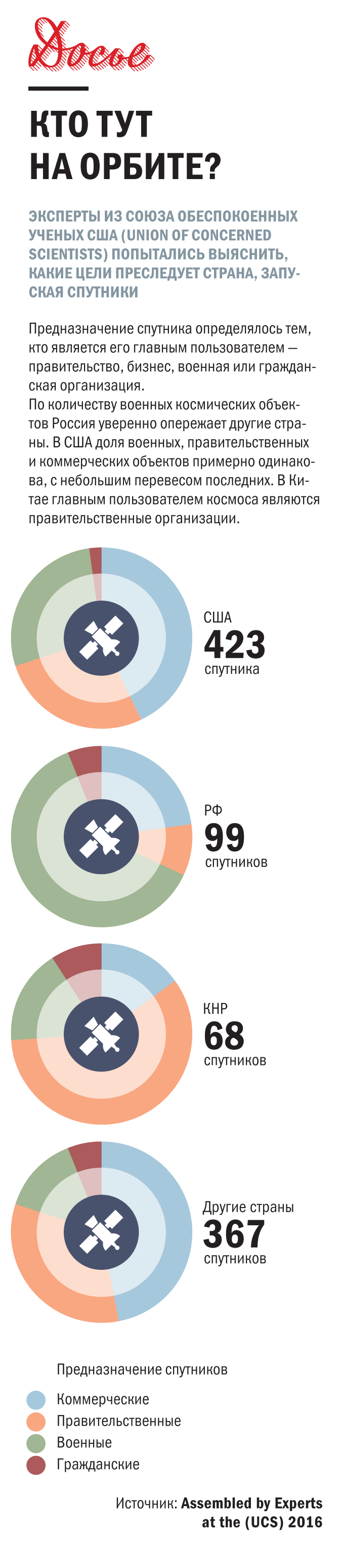 Если же речь идет о полноценных спутниках, то тут положение России выглядит печально. В прошлом году российская спутниковая орбитальная группировка состояла примерно из 131 спутника — при этом некоторые эксперты в приватном разговоре высказывали уверенность, что на самом деле их меньше чуть ли не на треть, так как информация о выходе из строя аппаратов не афишируется. Для сравнения, США имеет на орбите 593 спутника, а Китай 192 — это очень много, учитывая, что активно запускать аппараты на орбиту жители Поднебесной начали лишь в 1999 году после масштабной реформы космической отрасли.