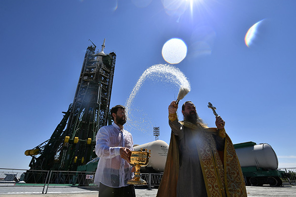 Обряд освящения ракеты-носителя «Союз-ФГ» с космическим кораблем «Союз МС-05» перед стартом. Байконур, 2017 г.