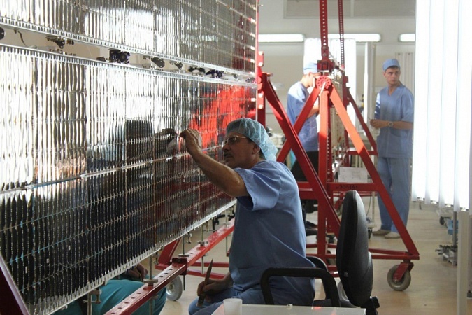 В частности, для этого применяется специальная установка — своеобразный имитатор солнечного освещения на орбите. С ее помощью за одну секунду можно проверить характеристики изготовленных солнечных батарей.