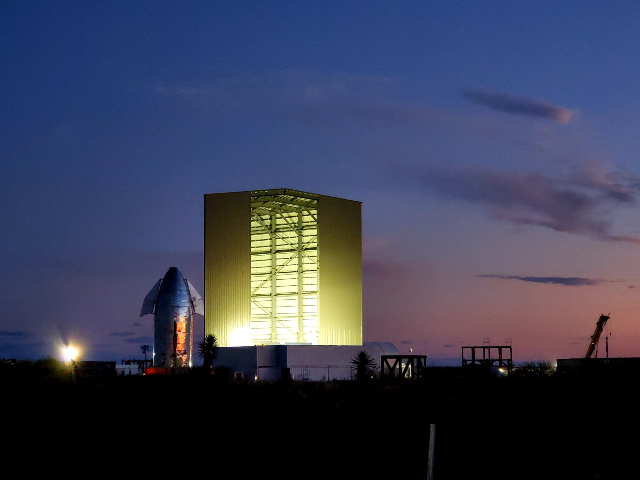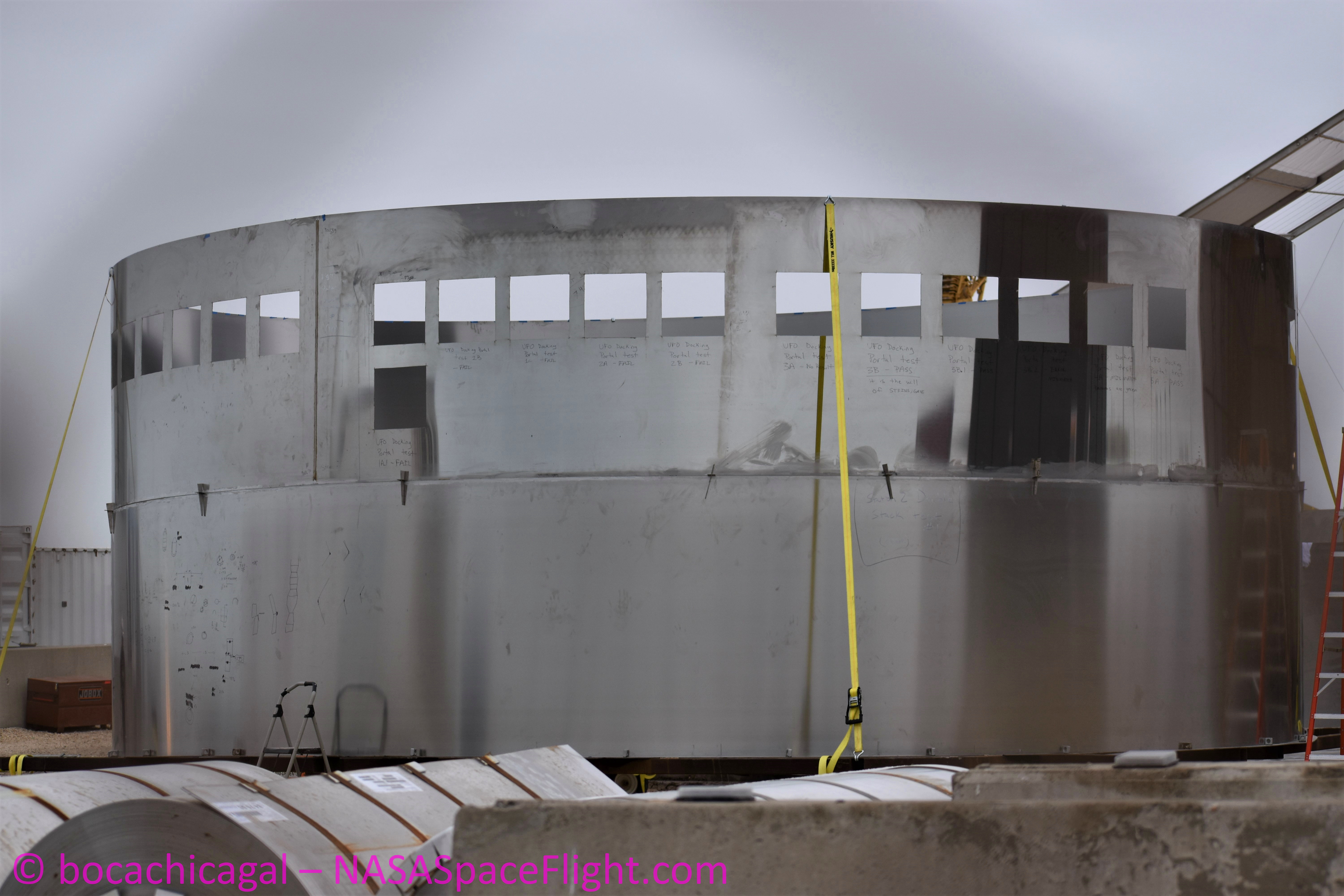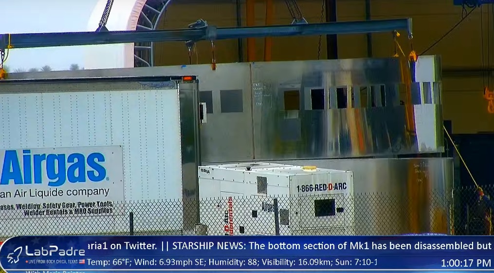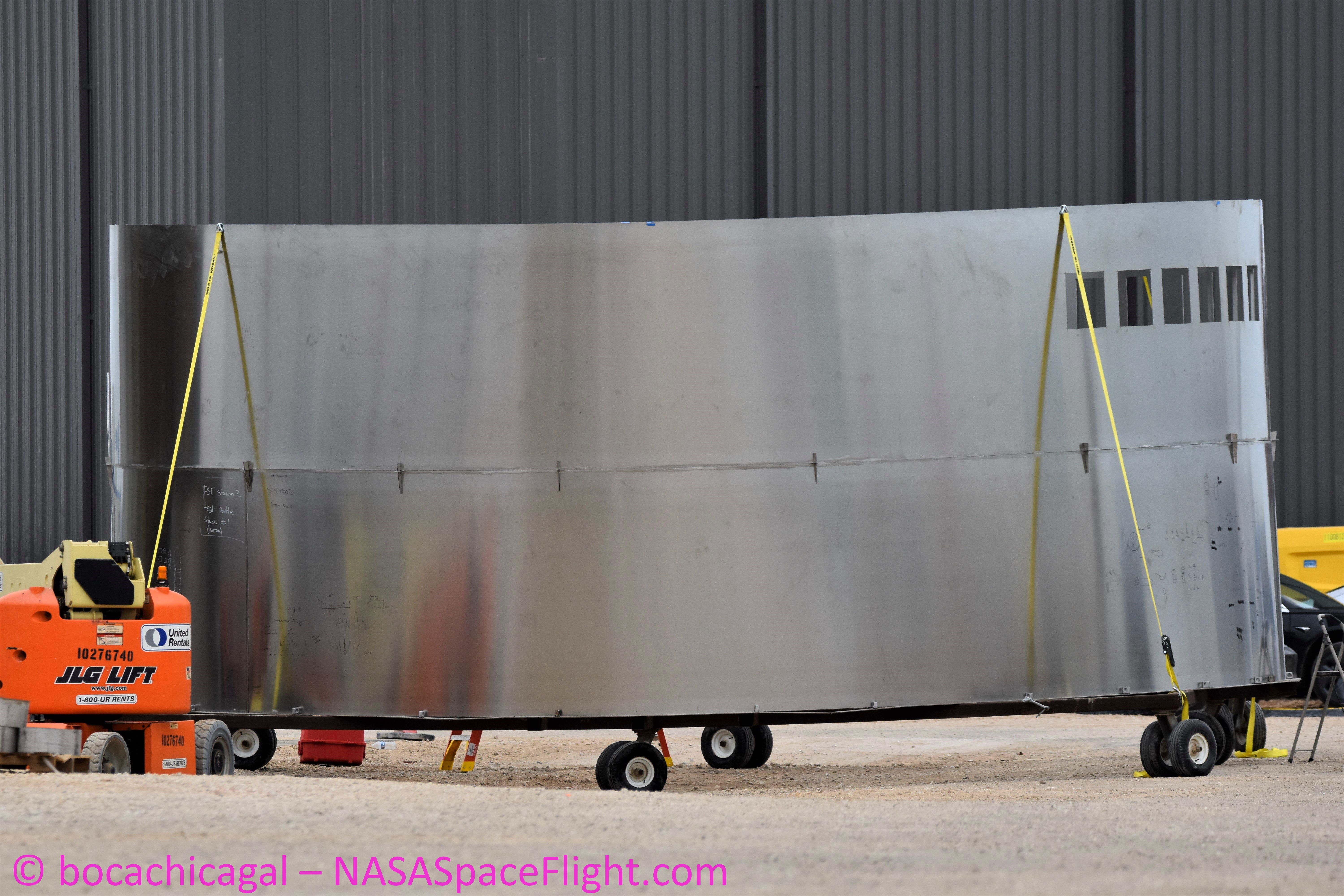 The bulkhead that was shipped from Florida seems to be hoisted up on a jig, crewmen seen sweeping underneath. Meanwhile a new structure by StarGate is being erected, possibly another ring assembly tent. As of now two of Mk3 rings have been spotted, many more to come & Mk1 nose.:f09f9a80: