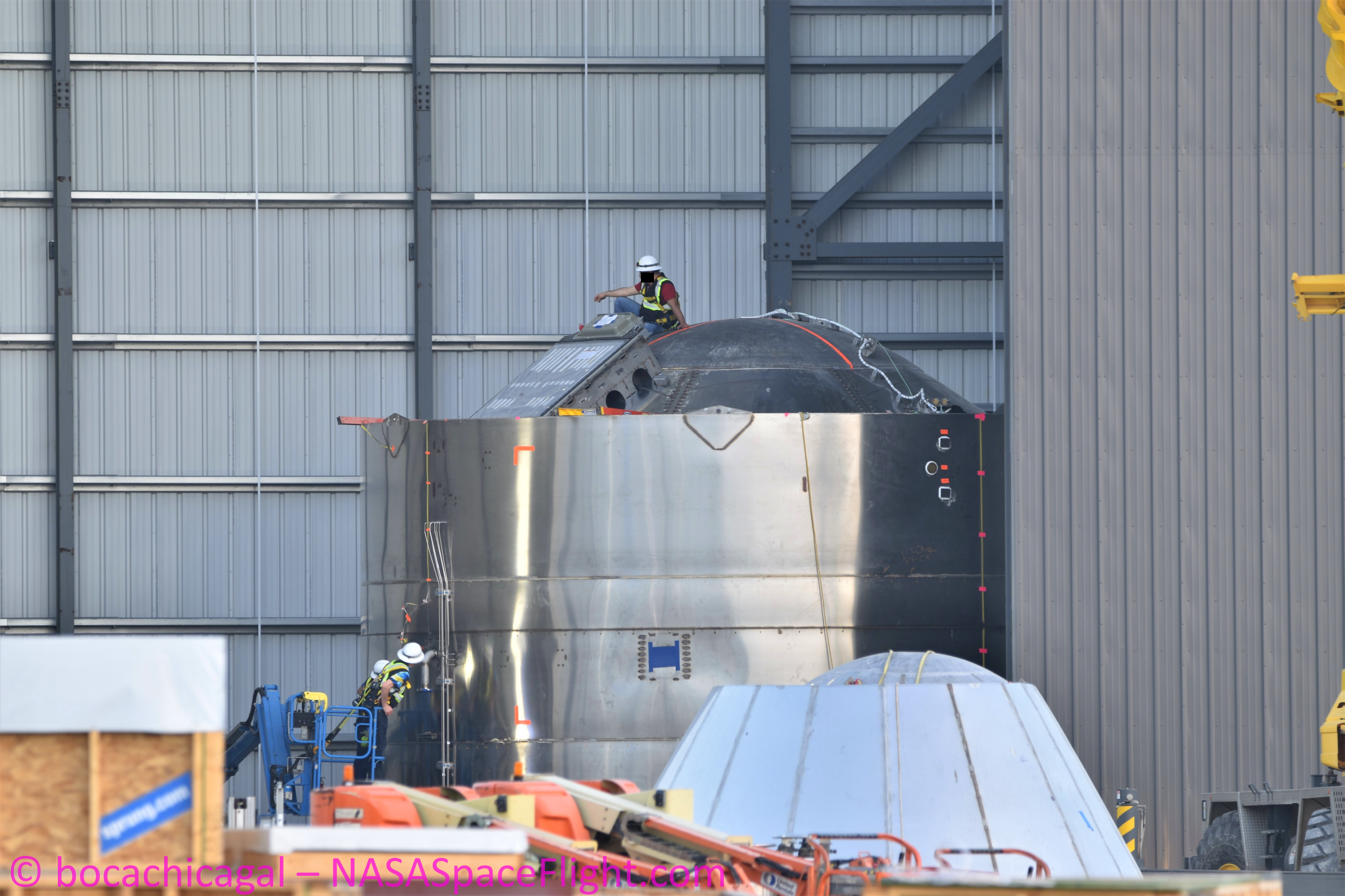 Но обтекатель всё же нужен, потому что в нем малый бак кислорода, который используется при посадке. Я уверен, что посадочные баки будут использоваться, начиная с самых первых "прыжков", ибо это главный элемент в новой технике посадки. Недаром на фотке (повторю ее еще раз ниже) посадочный бак подкрался почти вплотную к секции с верхним днищем. И сама эта секция состоит из трех колец (на SN1 аналогичная секция была из двух). Верхнее кольцо было бы необязательным, если бы не предусматривалось продолжение вверх, поскольку собственно днище приварено к среднему кольцу.