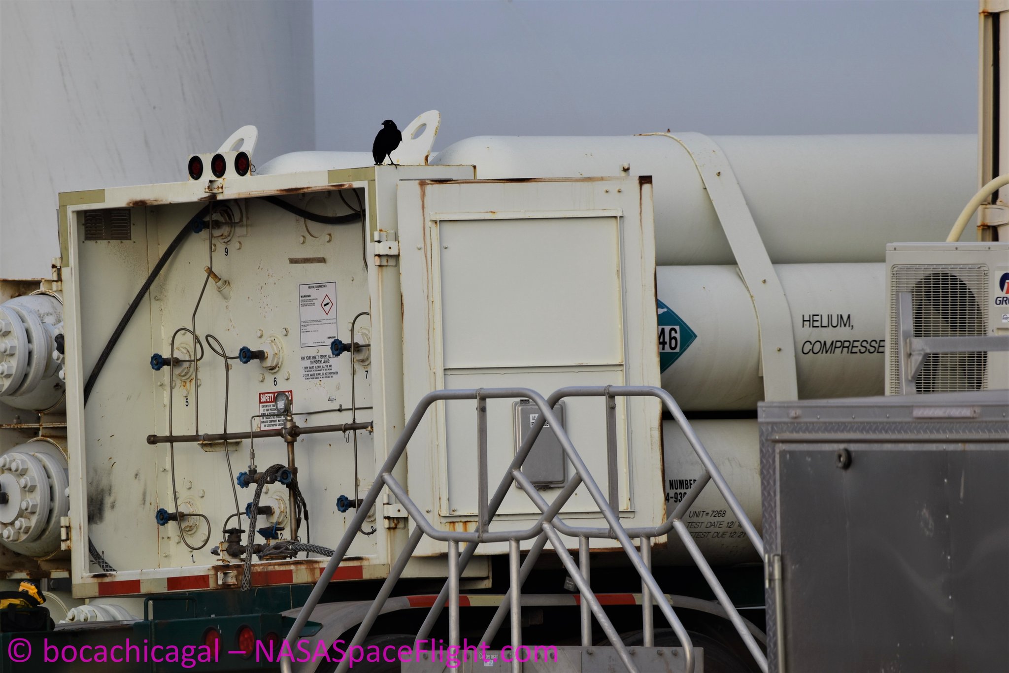 Тем временем контейнер был доставлен к месту старта, где осуществлялись поставки, включая доставку гелиевого резервуара и металлической опоры.