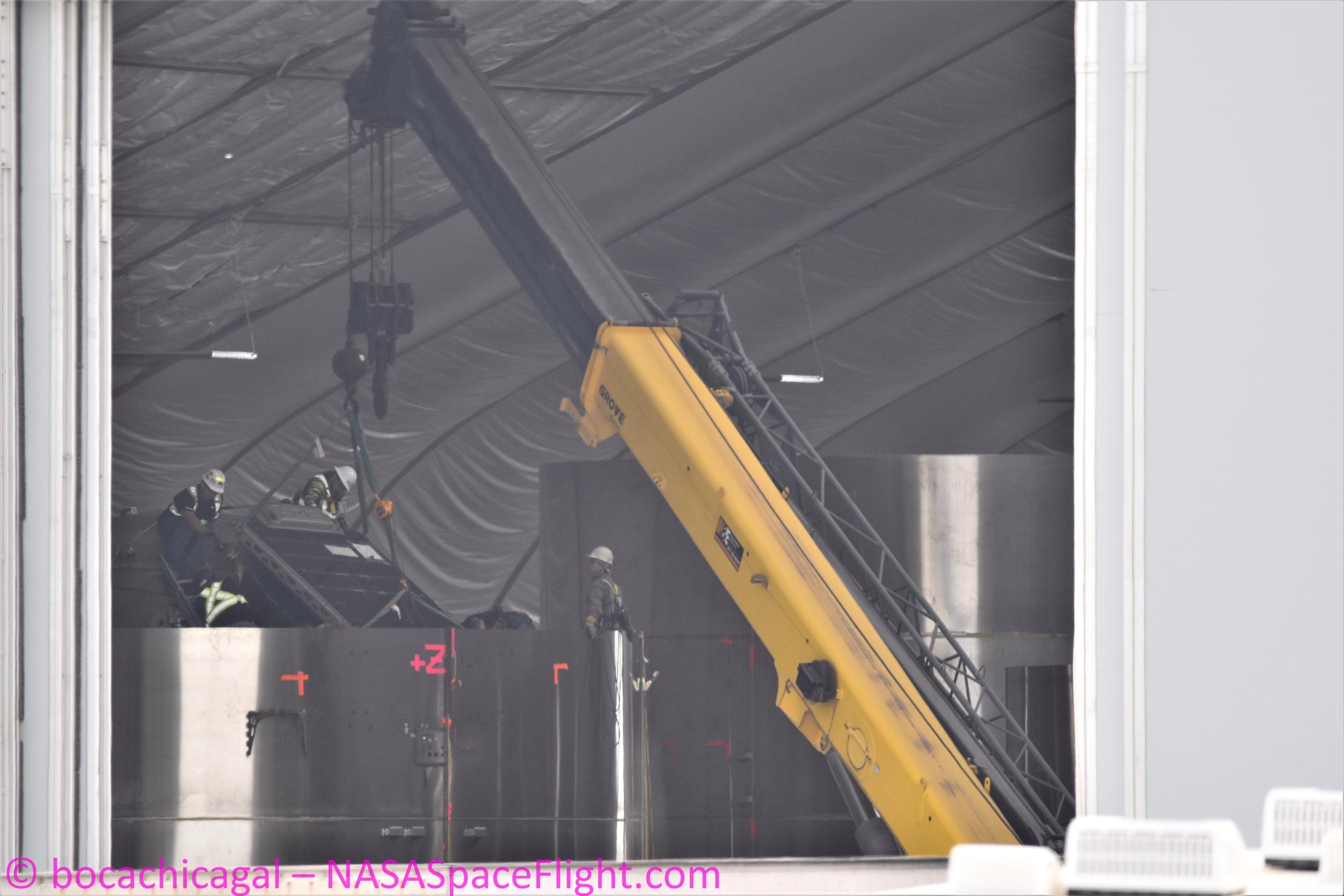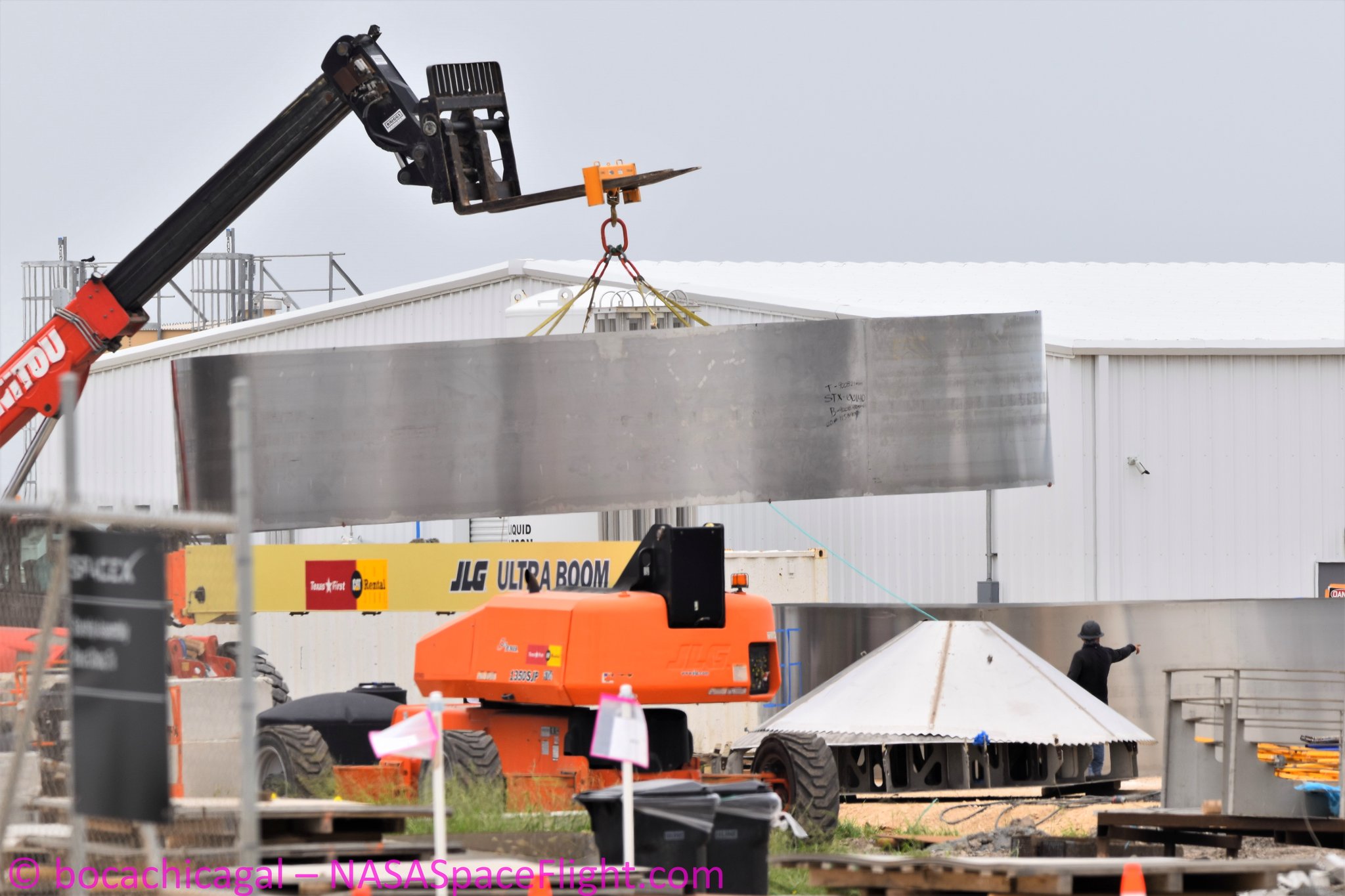 Между тем на стороне SN5 все идет быстро с установкой батареи #Tesla на верхнем куполе и транспортировка новых колец в большие палатки, в том числе двойной секции.