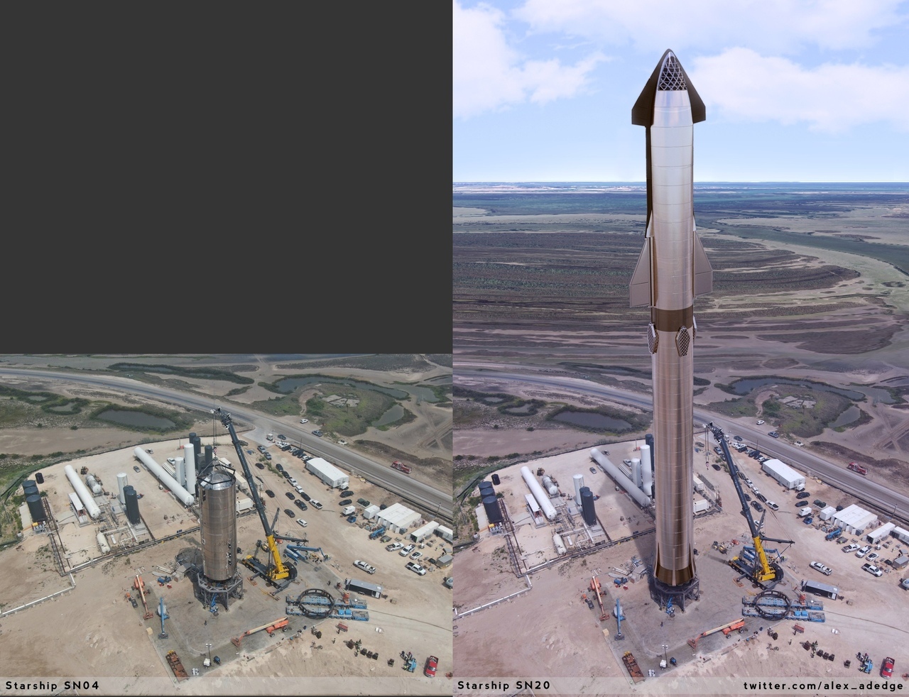 Я не очень доволен результатом, но подумал, что это достаточно хороший рендер, чтобы показать его. И, как всегда, вот сравнение с оригинальным фото, Это похоже на идеальный старт для SN04 перед его 150-метровым прыжком - взгляд на Starship SN04 помогает представить как это будет в реальности! Впереди захватывающие времена!