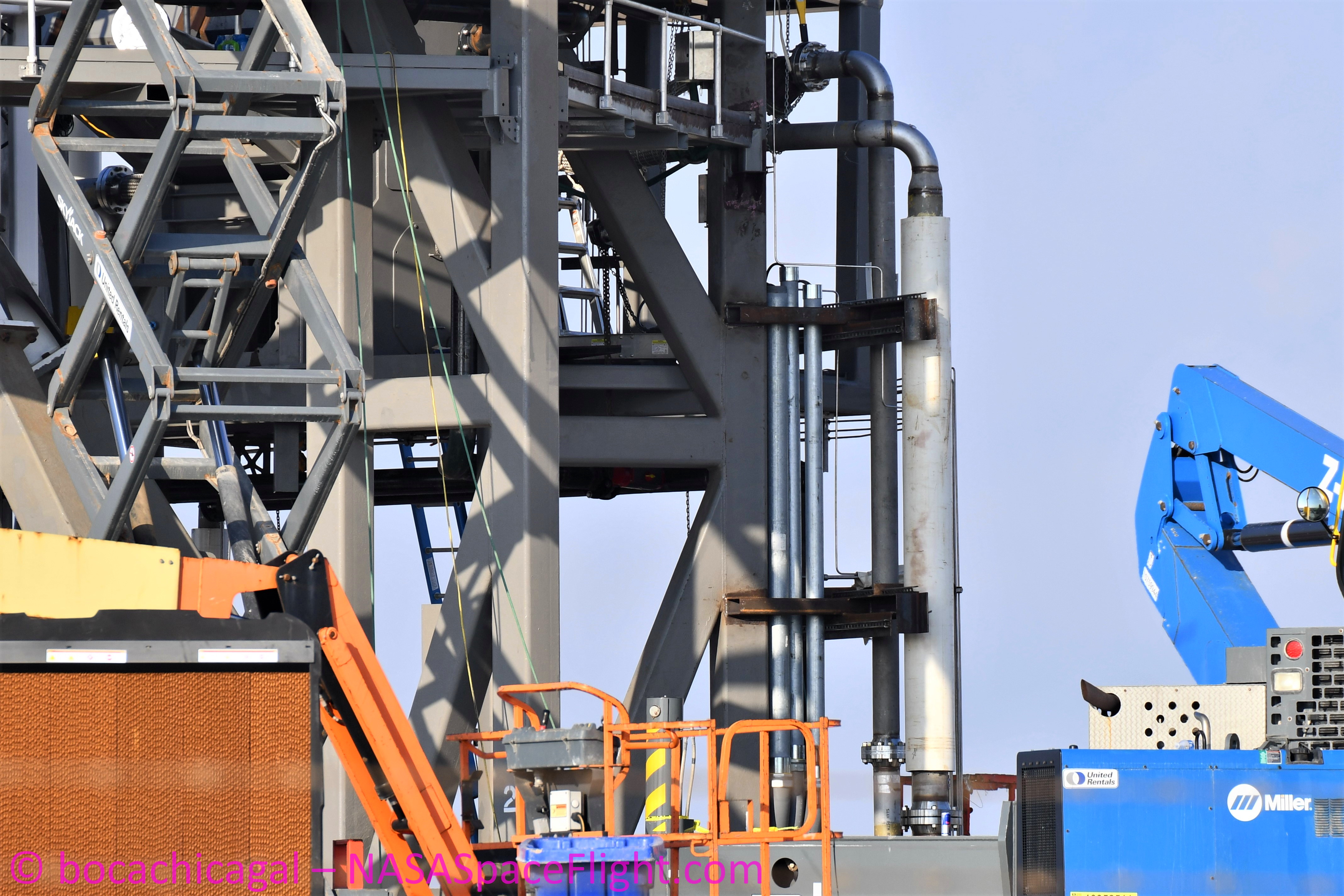 Подводка труб к стартовому столу еще не завершена. Две толстые трубы подключены, а три которые потоньше пока нет: