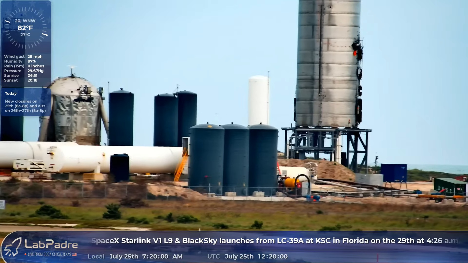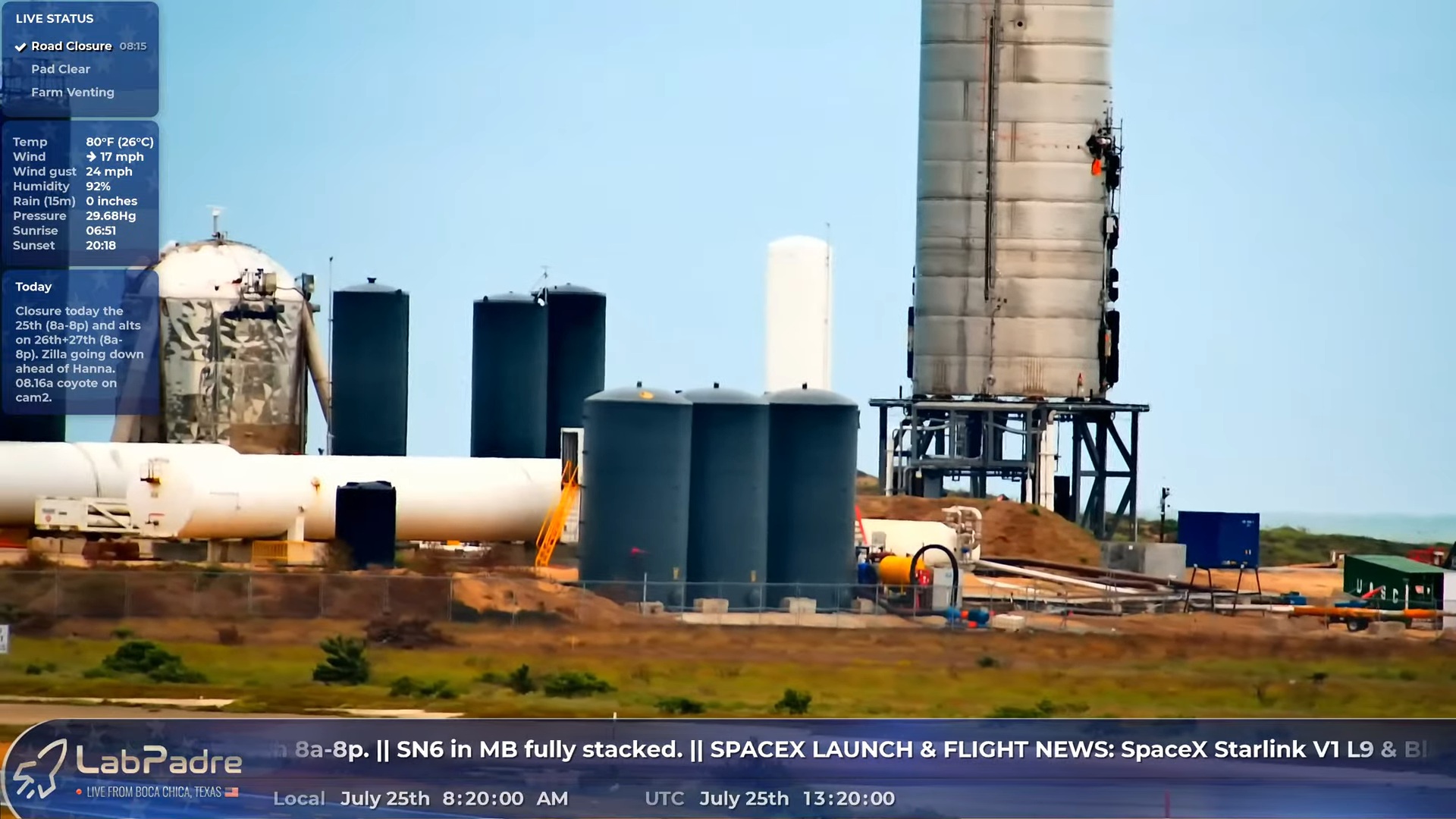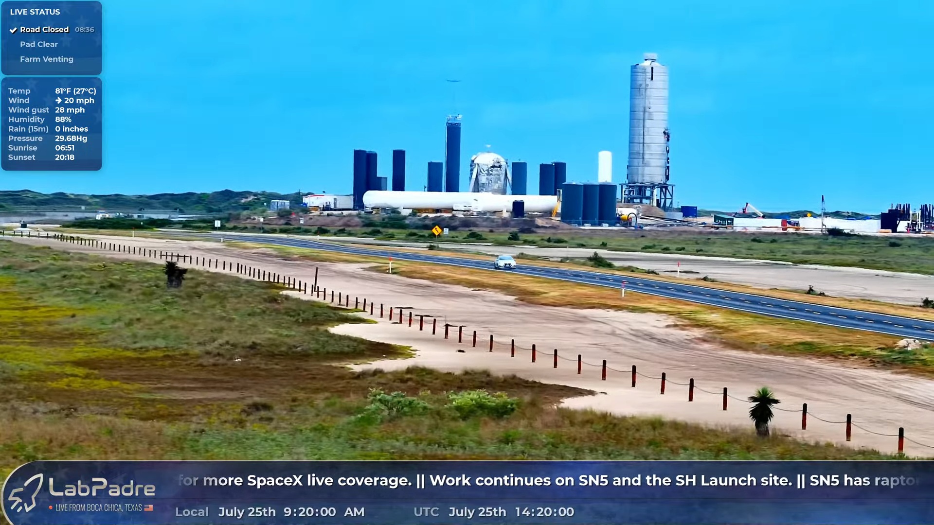 На 07:20 местного времени в Бока Чике небо чистое, ветер северо-западный 20 миль в час. По-моему, погода не против, чтобы сегодня зажечь. Окно открывается в 08:00. В данный момент людей и техники около объекта не заметно.