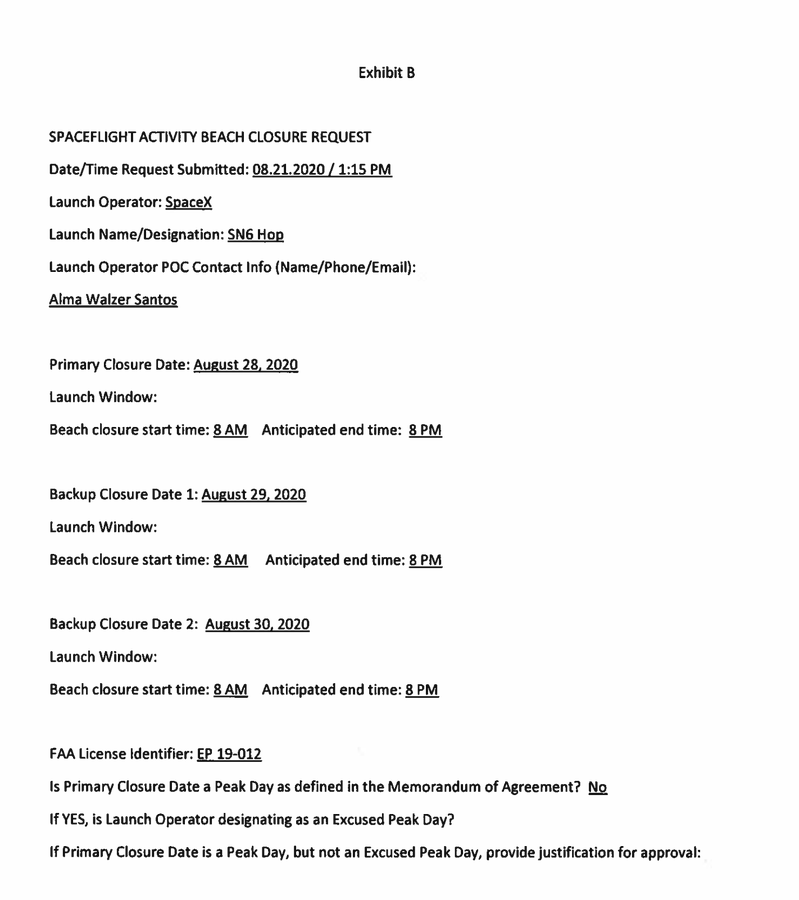 SpaceX is targeting Aug. 28 for the 150-meter hop of Starship SN6, per the latest road closures. Backup opportunities are available on Aug. 29 and 30. Windows are 8 am to 8 pm central on each day.