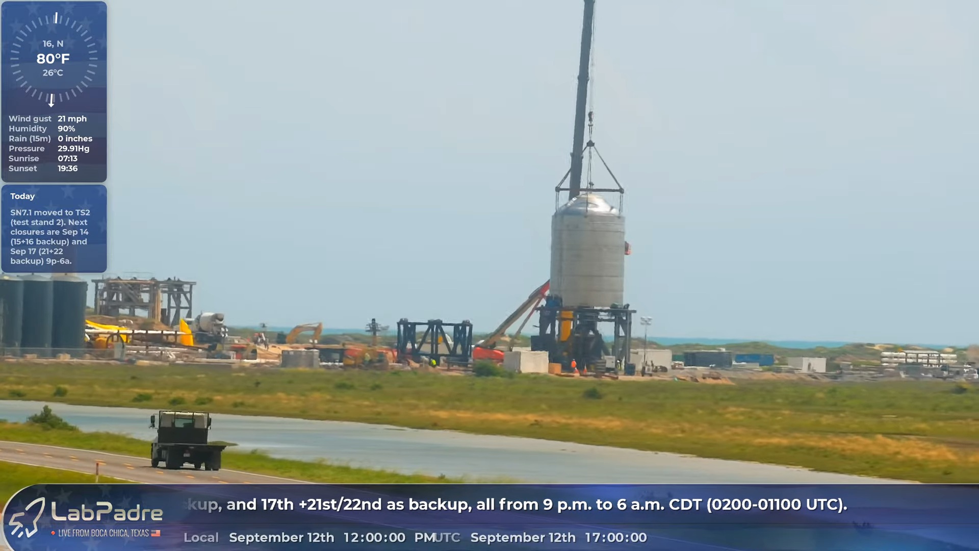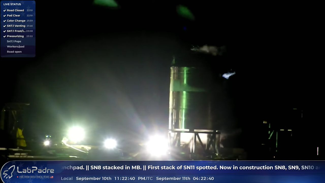В Бока Чике полдень. SN7.1 ночью был установлен на испытательный стенд №2: