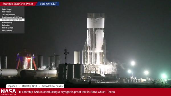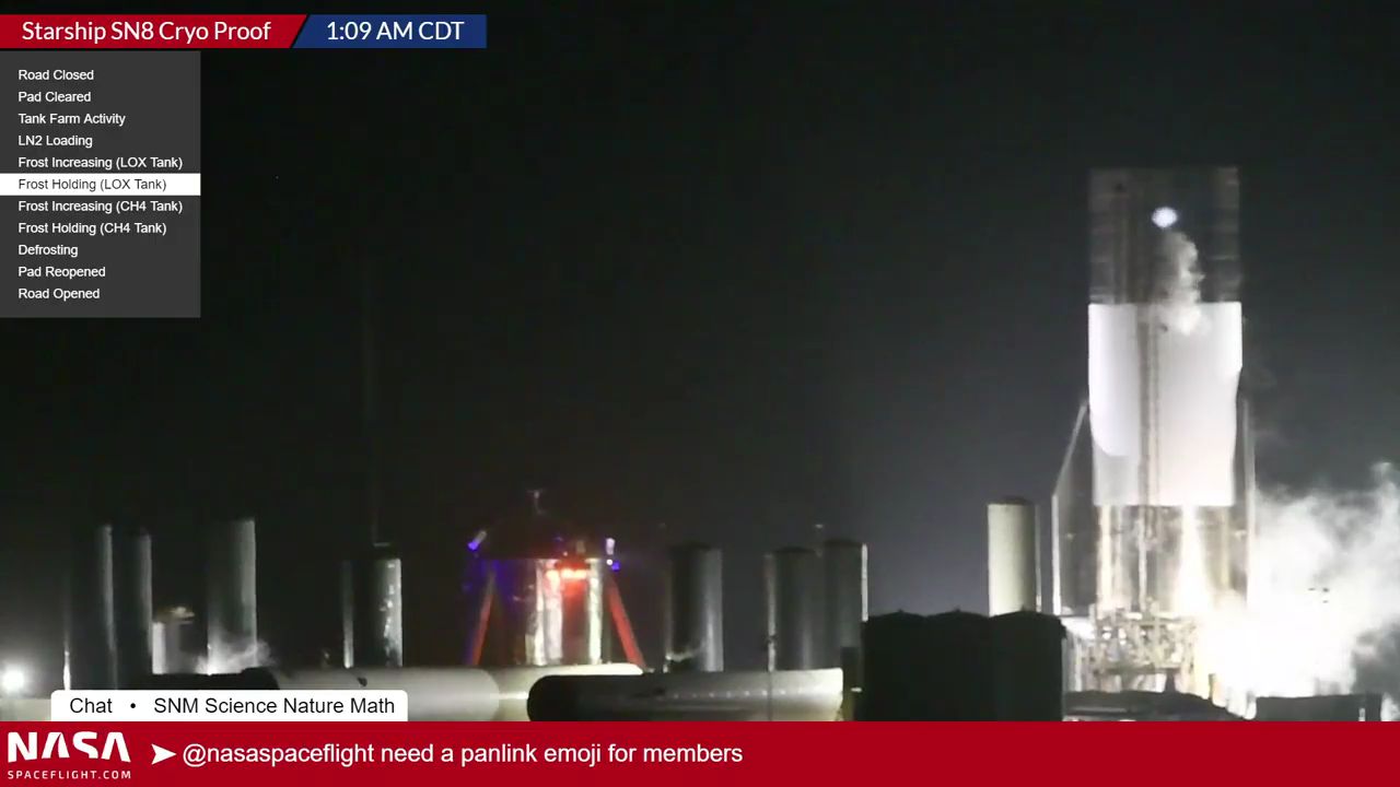 Сегодня ночью SN8 тестируют уже 3-й раз. Похоже на тест на быструю заправку обоих баков...