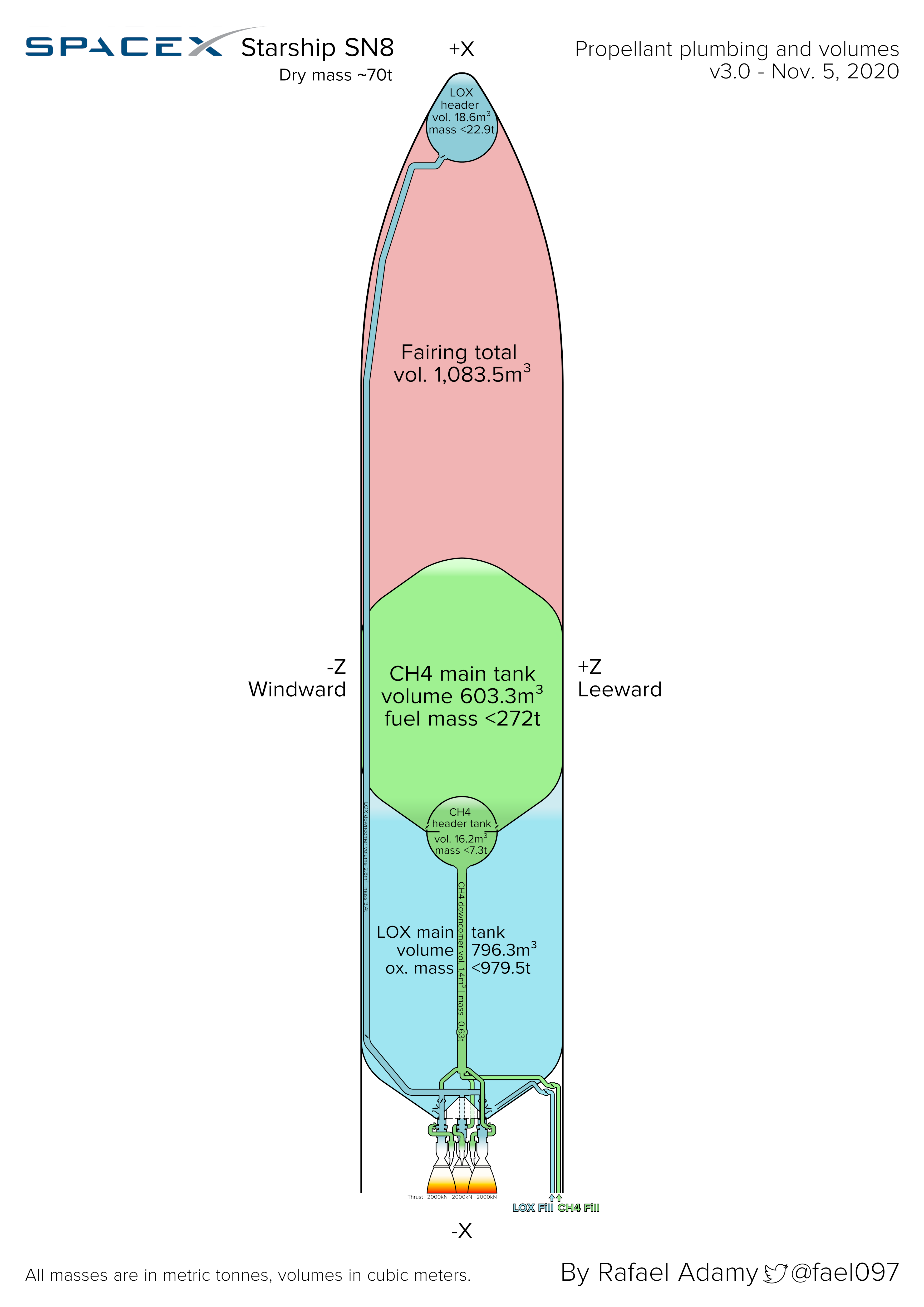 Неофициальная диаграмма SN8 (автор Rafael Adamy) с объемами баков и массой топлива и окислителя при полной заправке: