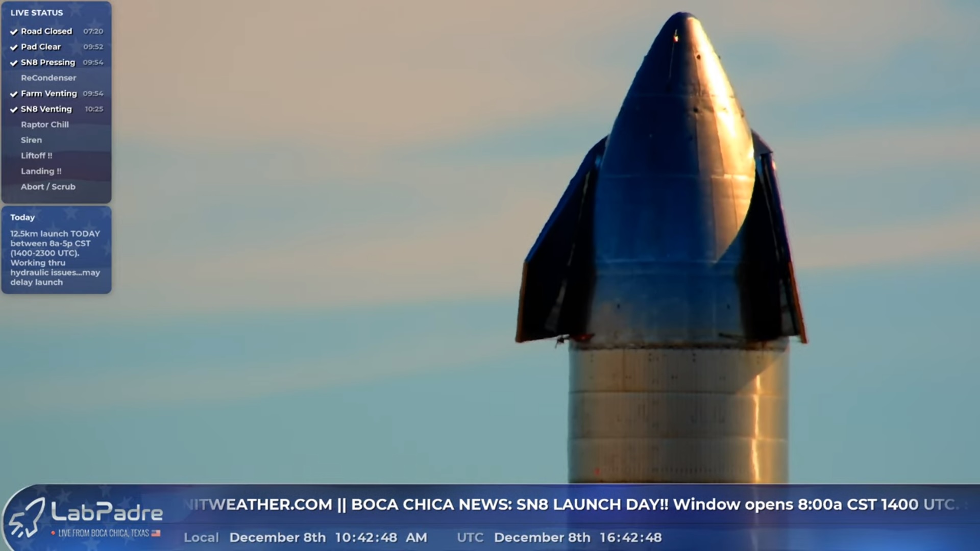 "Starship SN8 | 12.5 km Flight Go for Launch L - 00 : 01 : 30 : 43 December 8th, 2020 - 6:00 PM GMT+0000"