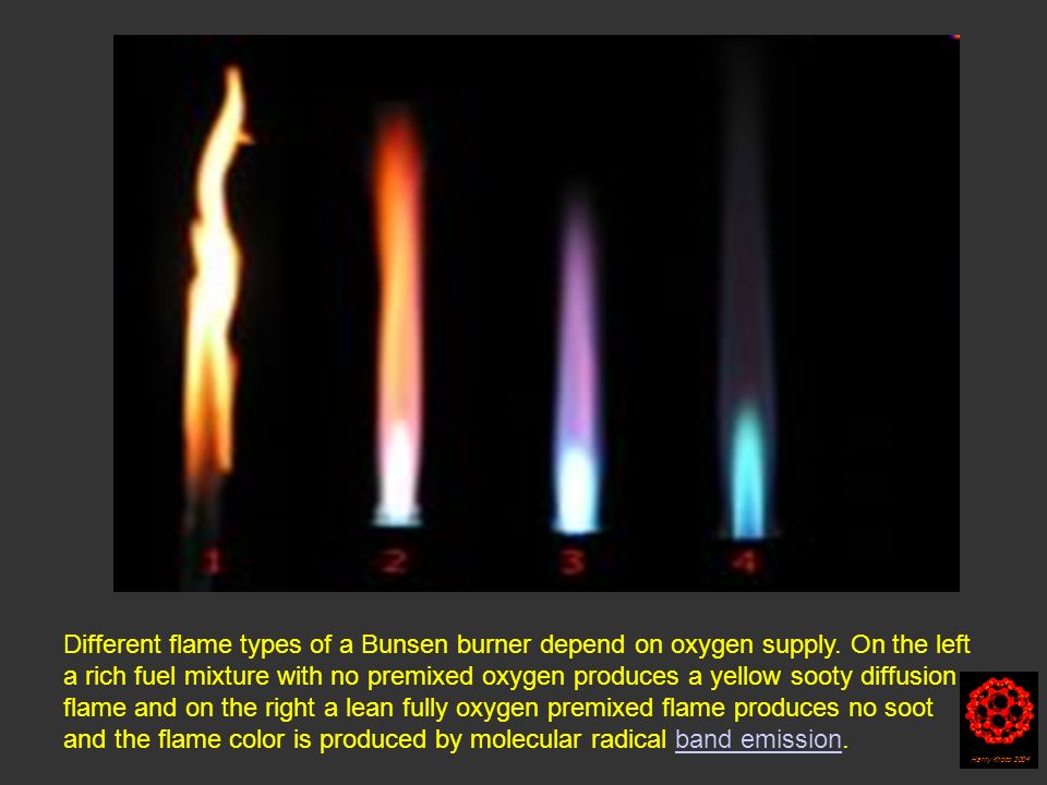 Если кислорода много, то пламя более синее, и наоборот.