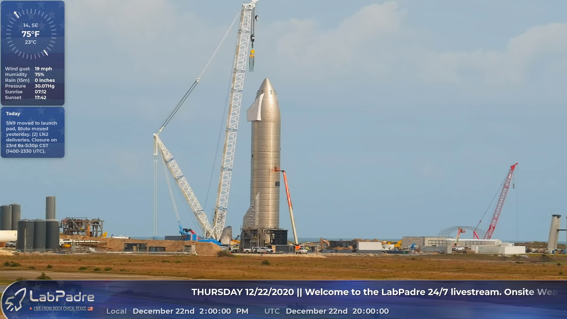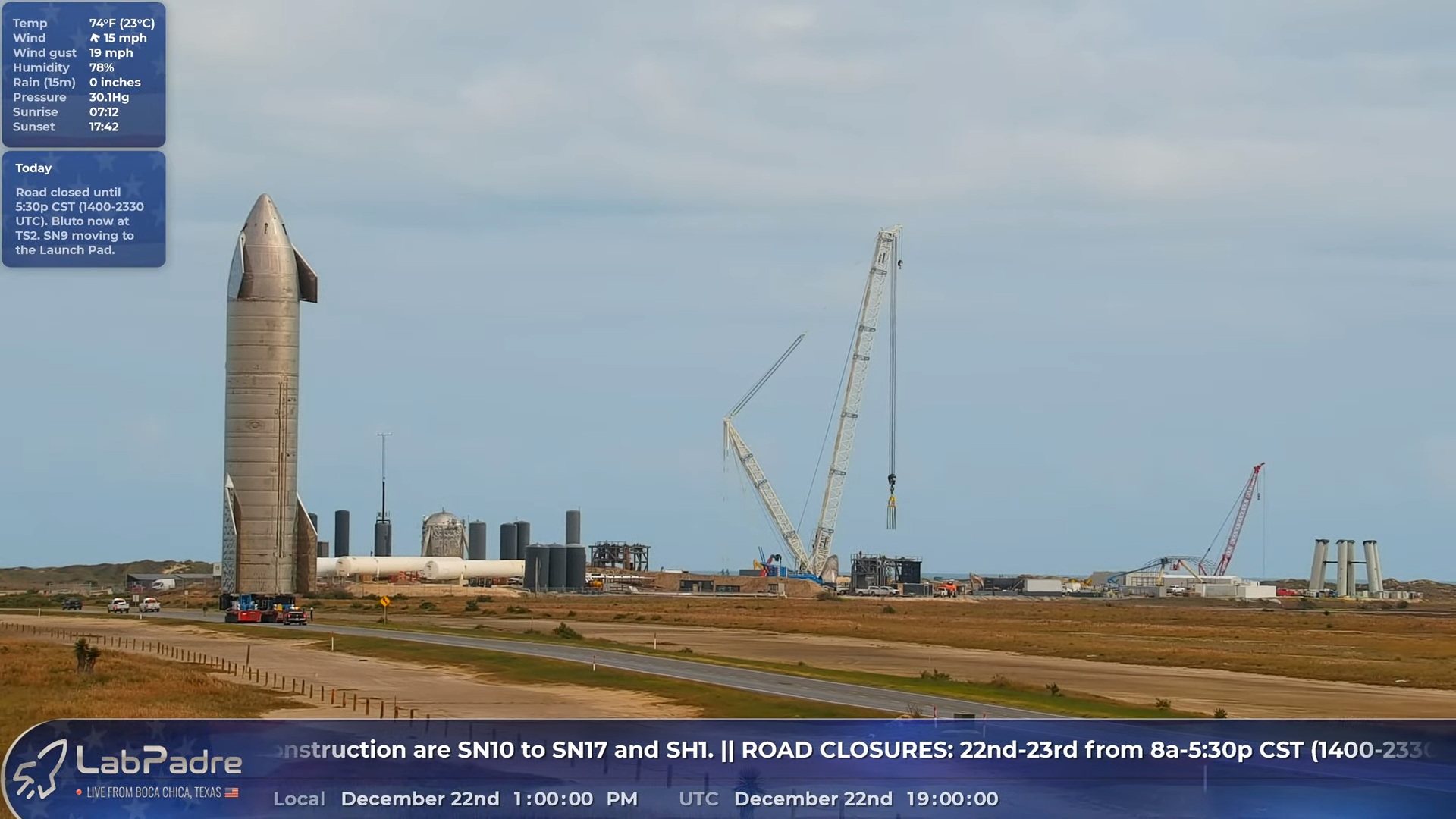 13:00. Подъезжает к космодрому: