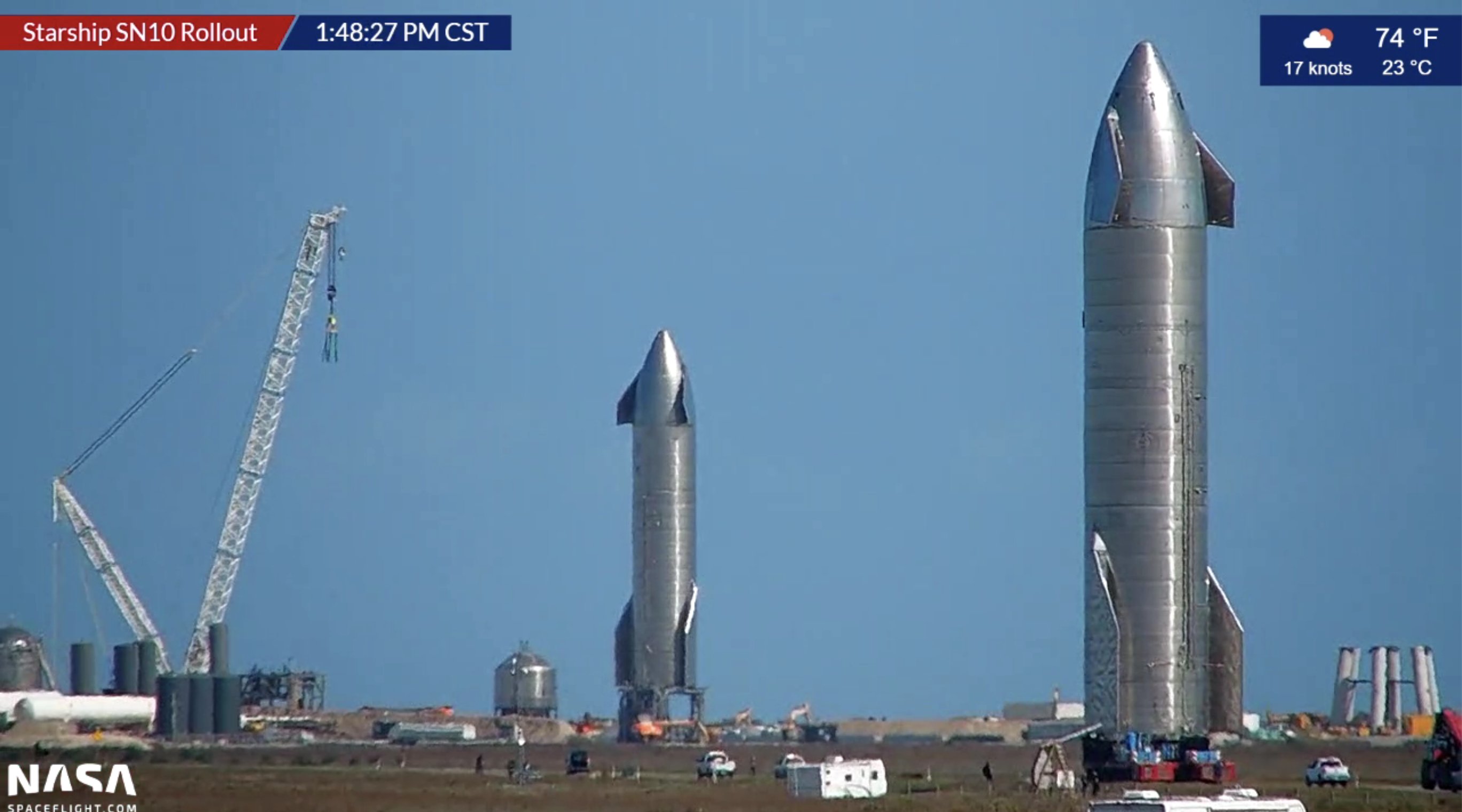 Два звездолета в одном кадре! Starship SN10 направился к стартовой площадке, пока SN9 ждет разрешения на запуск от FAA, а испытательный танк SN7.2 ждет своего взлета.