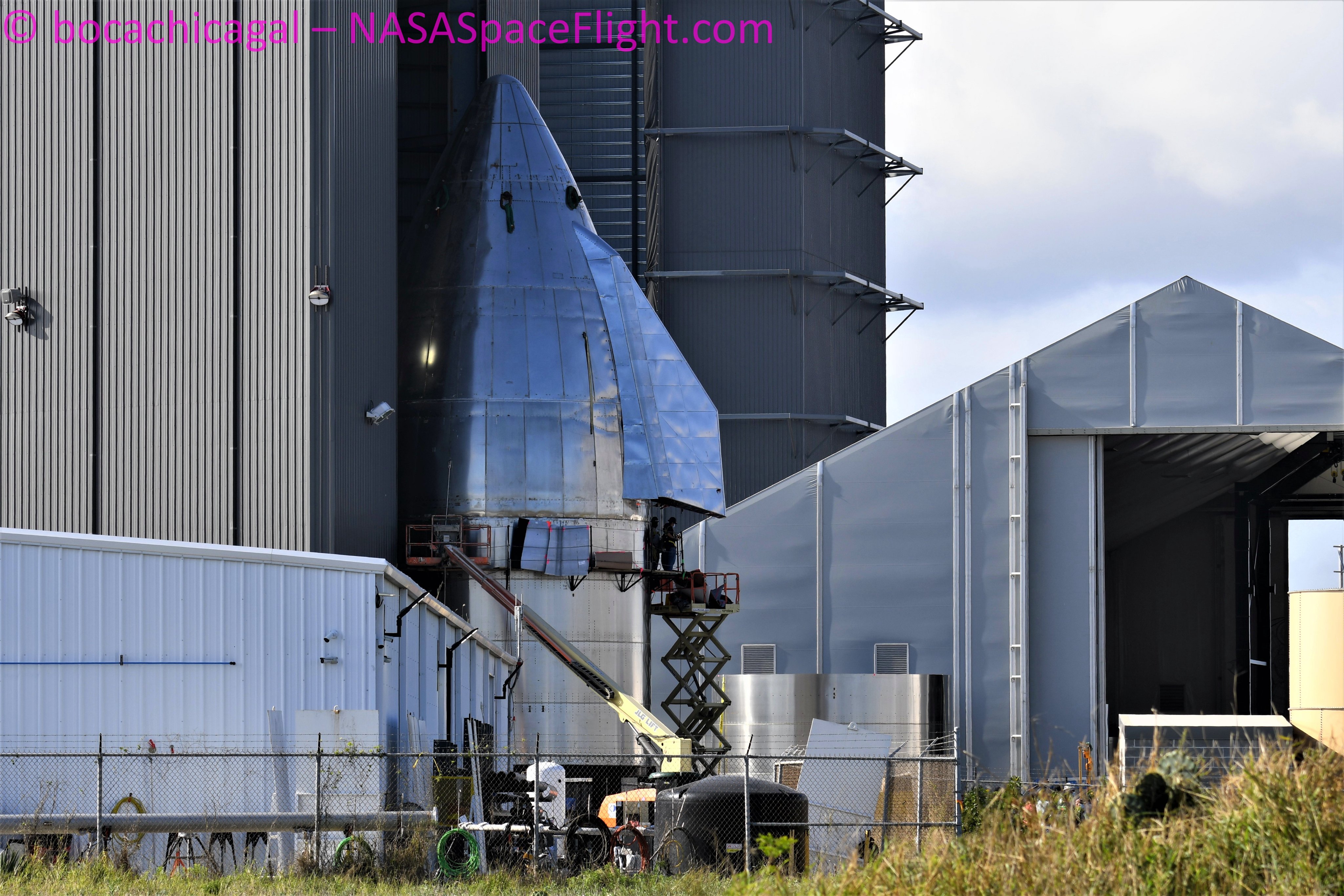 Операции на носовом конусе#SN11 В конце концов, сварка обеих частей выглядит законченной, но очень низкого качества. Однако на месте десантные баки находятся снаружи, а передний купол находится на опоре.