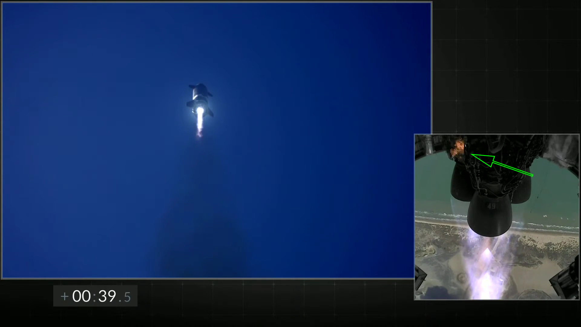 Один из двигателей дымится на протяжении всего пути, также постепенно разгораются системы и оборудование с внутренней стороны юбки: