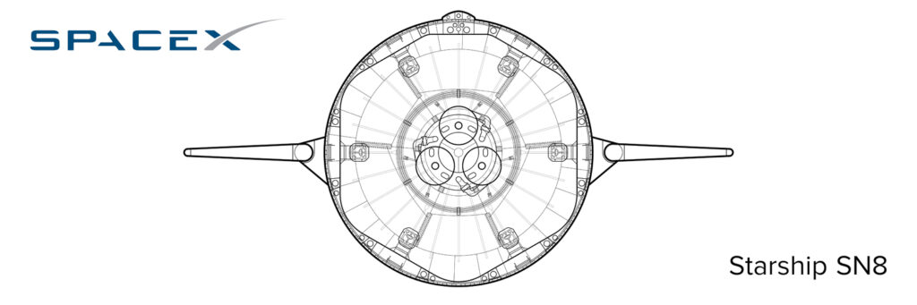 Прототипы SN8 и SN9 снабжены тремя центральными двигателями Raptor Sea-level. Они обеспечивают взлет прототипа, заполненного топливными компонентами менее чем наполовину от полной заправки. Для тропосферы вверх (10-12 километров) и опробывания управляемого снижения и посадки этого хватает с запасом (наглядно взрывавшемся на финише). Старт, набор высоты и управляемое аэродинамическое снижение прошли безупречно. Взлет на трех двигателях, затем с набором высоты планово выключался один, позже другой, а в верхней точке траектории — и третий двигатель. После аэродинамического снижения плашмя запускались два двигателя из трех, на которых производилась посадка.