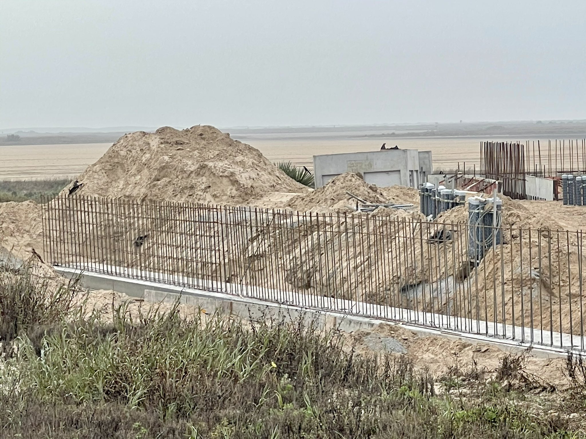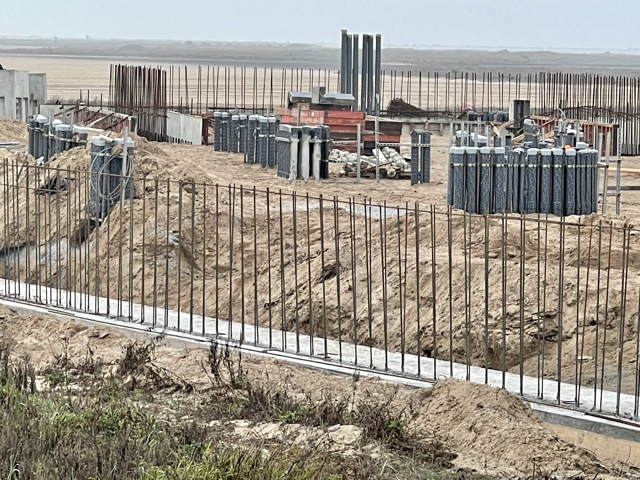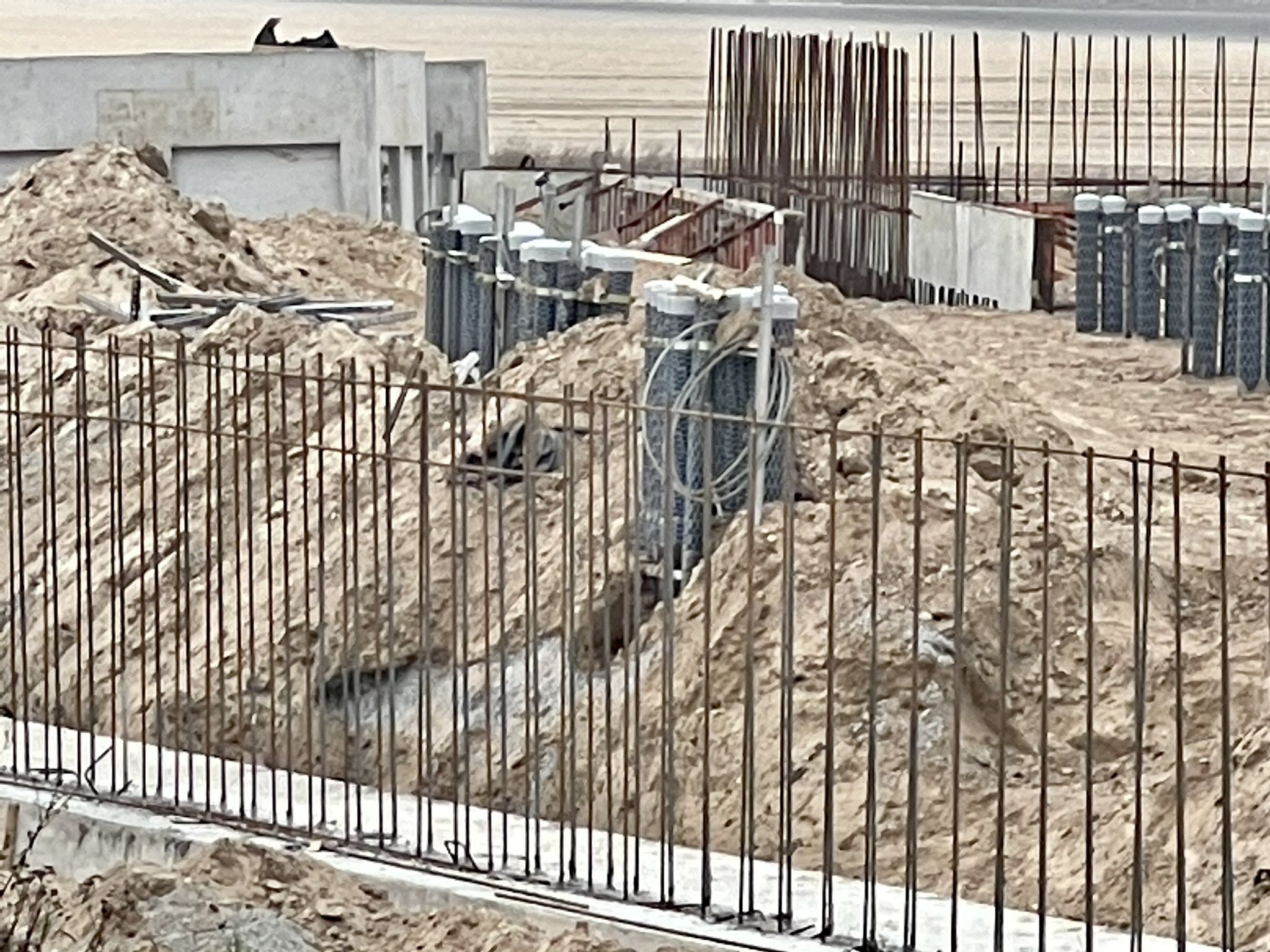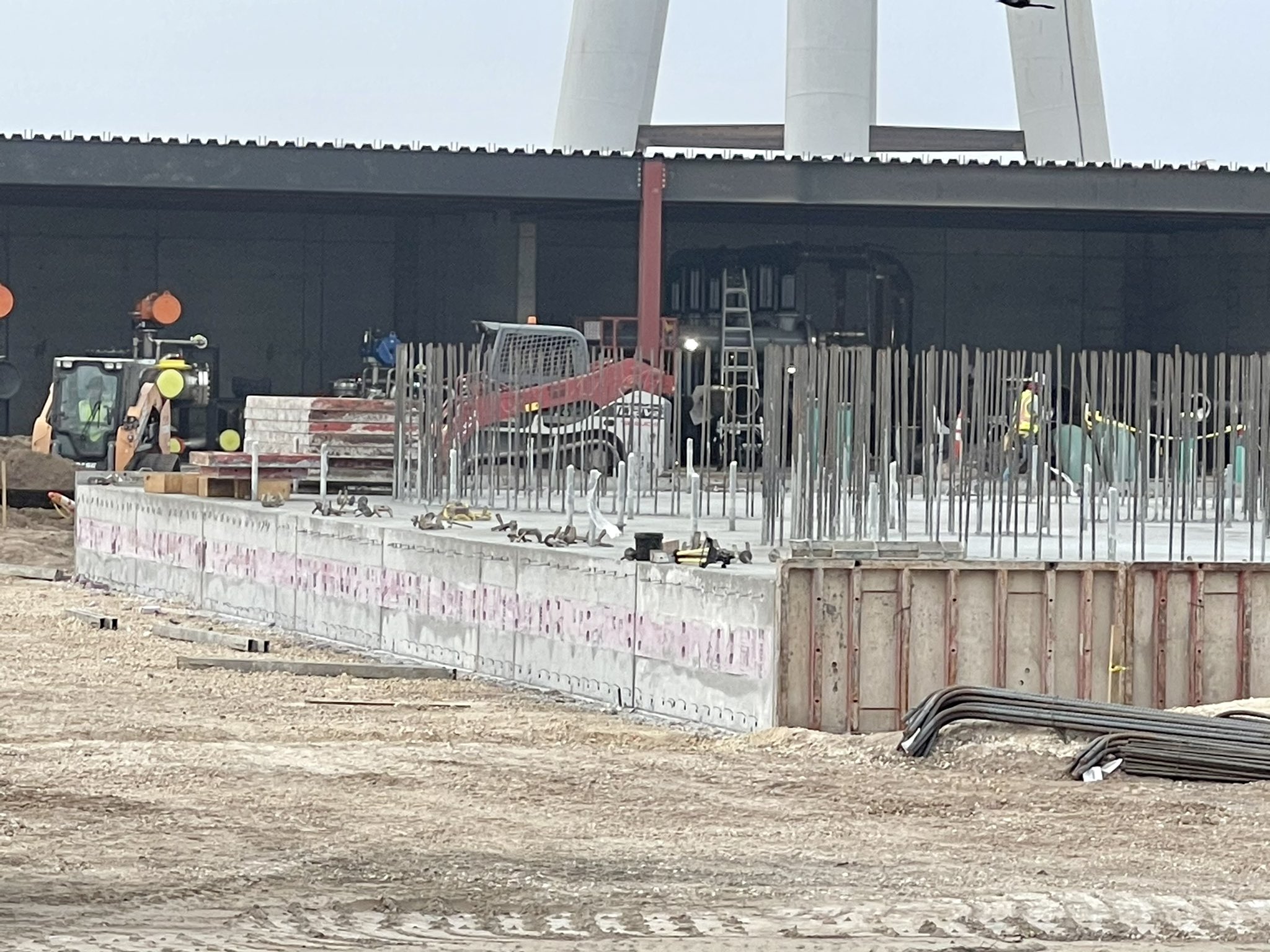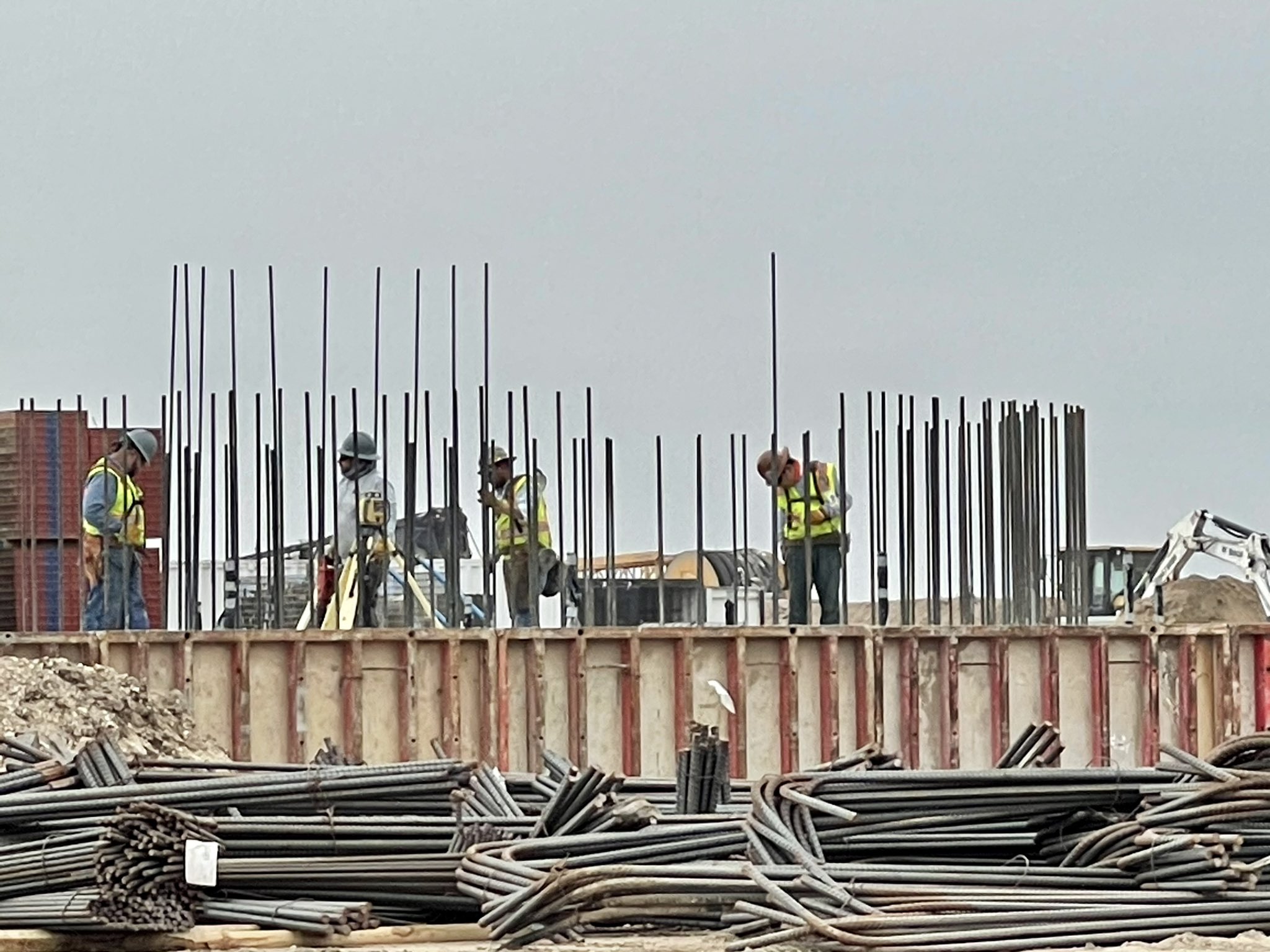 Бригады начали связывать более высокие куски арматуры у нового фундамента.