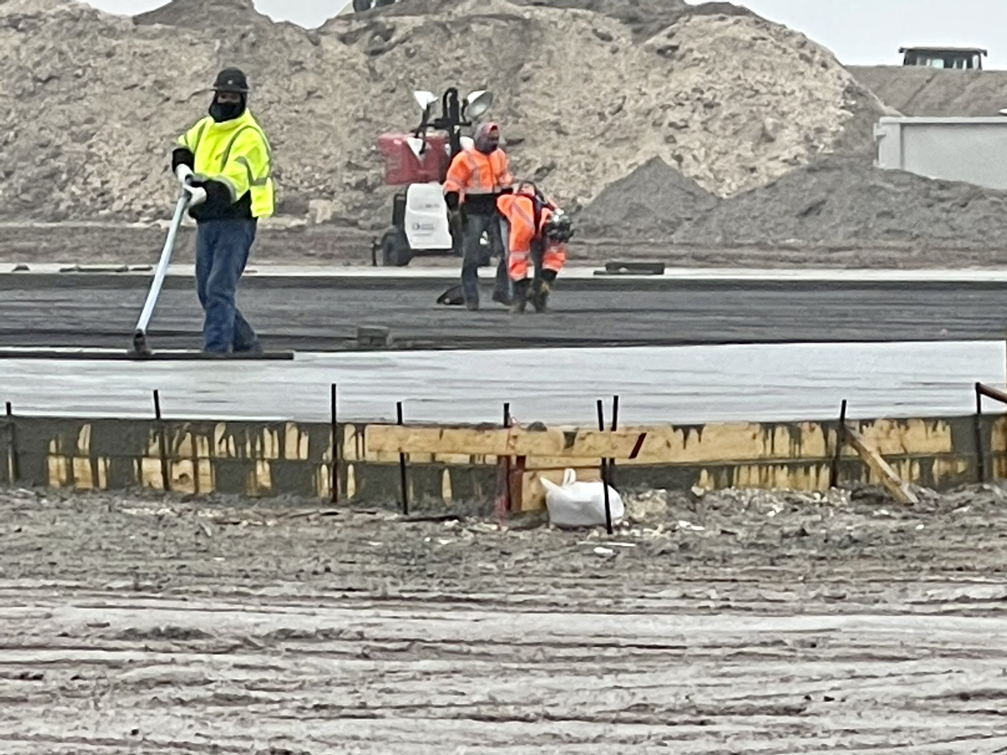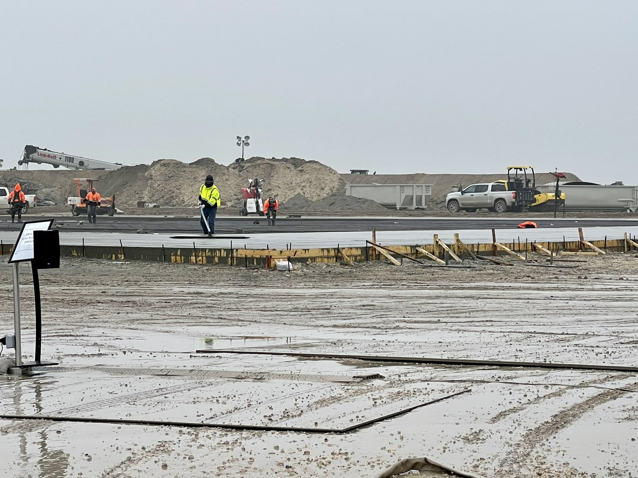 Заливка бетона на посадочной площадке идет полным ходом. Они заполнили формы до самого верха.