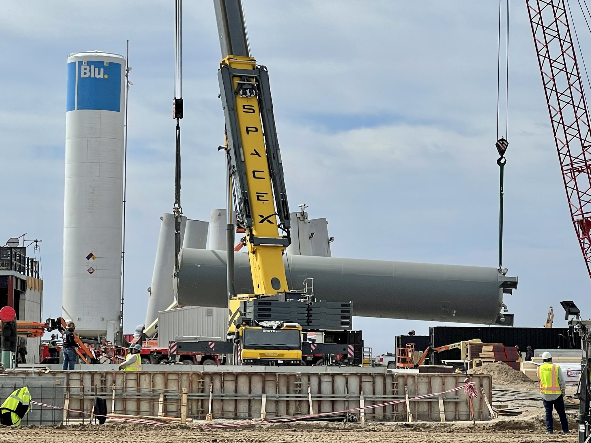 Второй топливный бак идет вертикально на орбитальной стартовой площадке SpaceX.