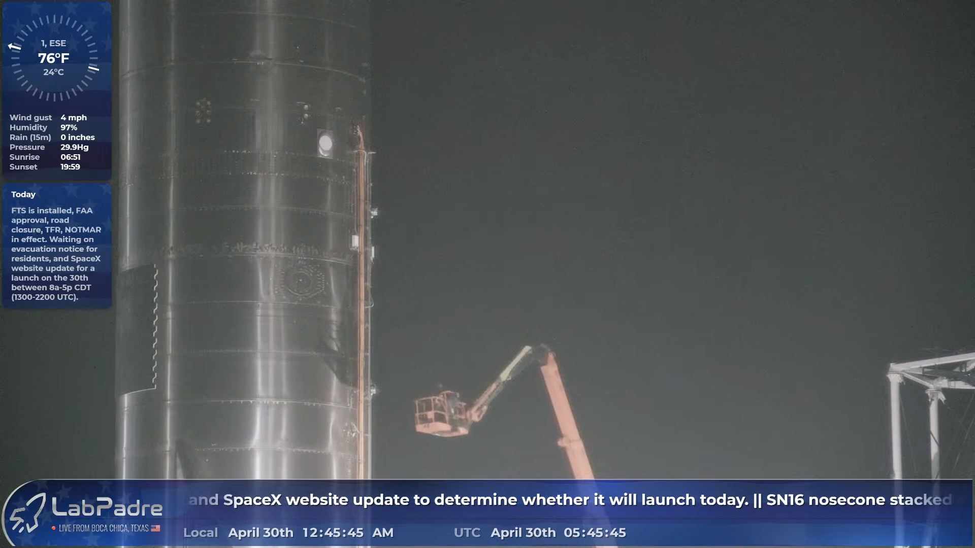 SpaceX еще не подтвердила официально планы пятничной попытки запуска в социальных сетях или на SpaceX.com, и компания еще не разослала уведомления об эвакуации немногим жителям, которые все еще живут в деревне Бока-Чика. Кроме того, погодные условия, вероятно, будут плохими в пятницу, и Starship SN15 до сих пор не оснащен взрывоопасными зарядами системы прекращения полета (FTS) - шаг, который обычно выполняется за 24+ часа до предыдущих попыток запуска Starship.