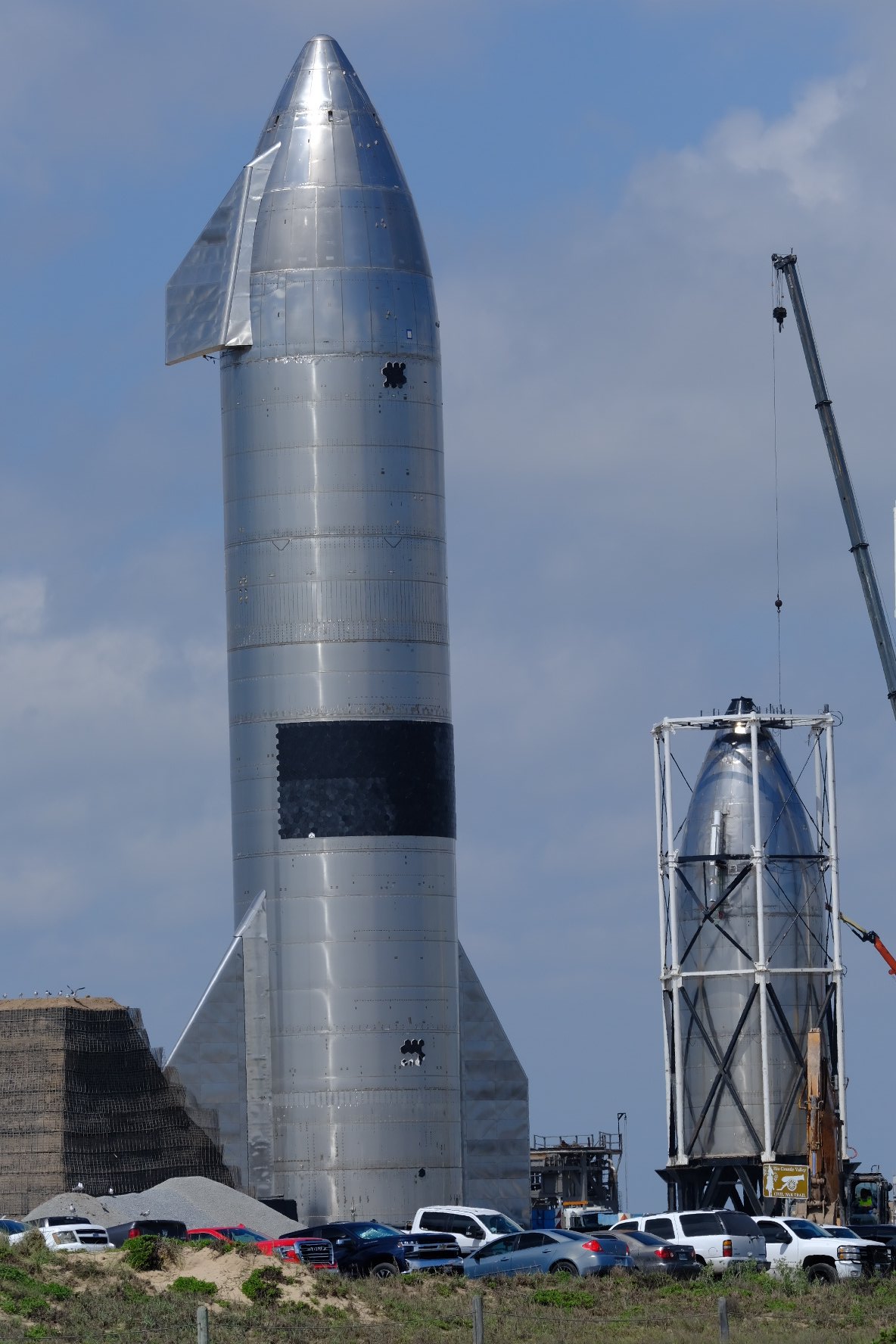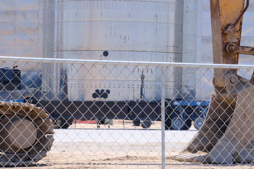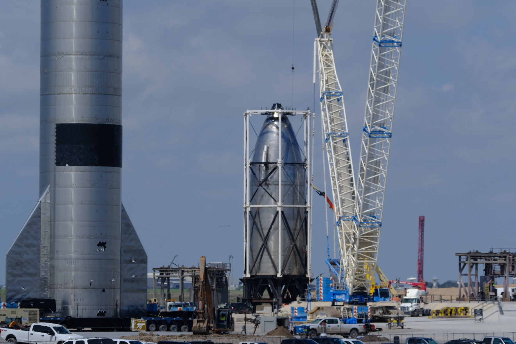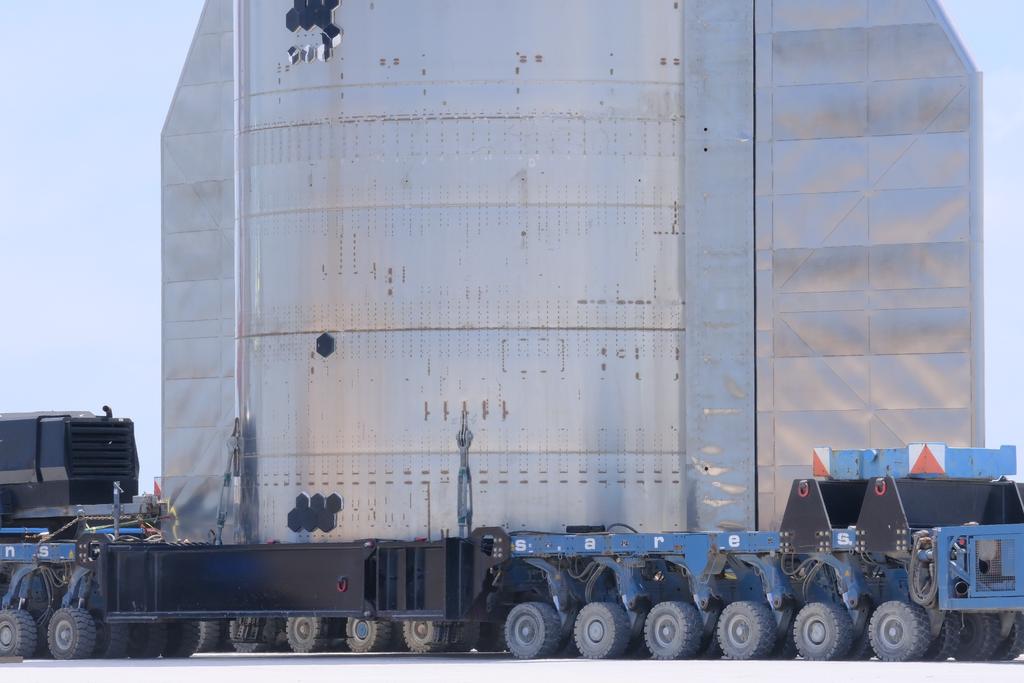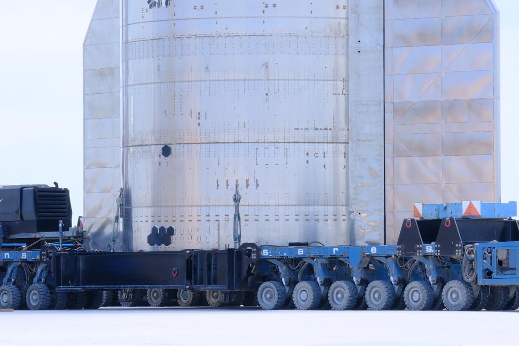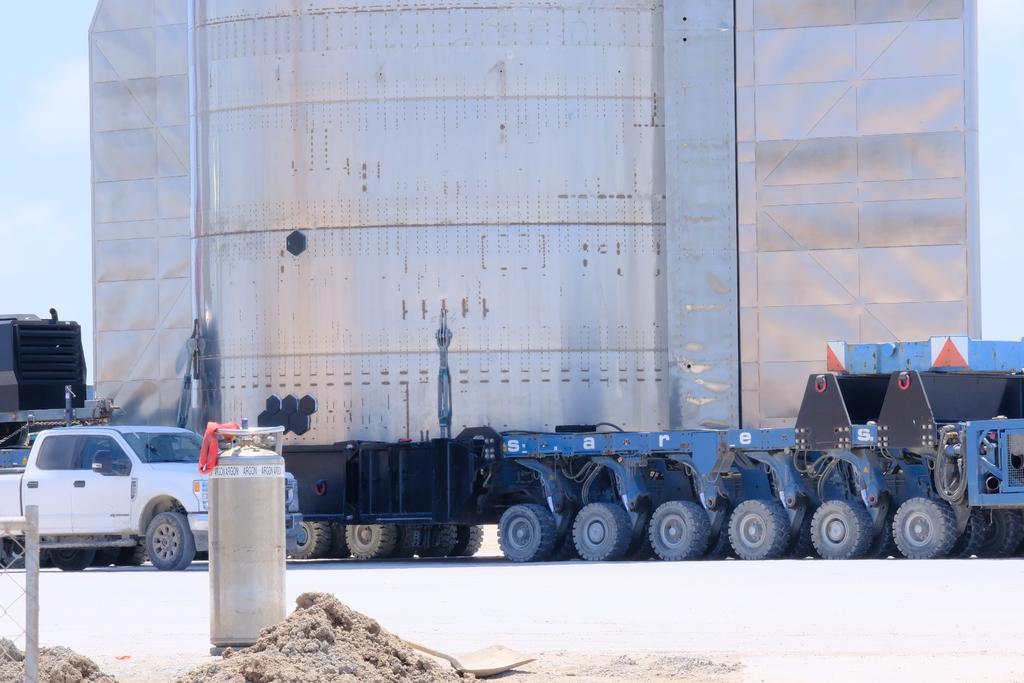 Вижу две, причем кажется они не касаются площадки. В этом случае SN15 уже на транспортере, причем оказался он на нем без использования крана. Пока непонятно, как это получилось.