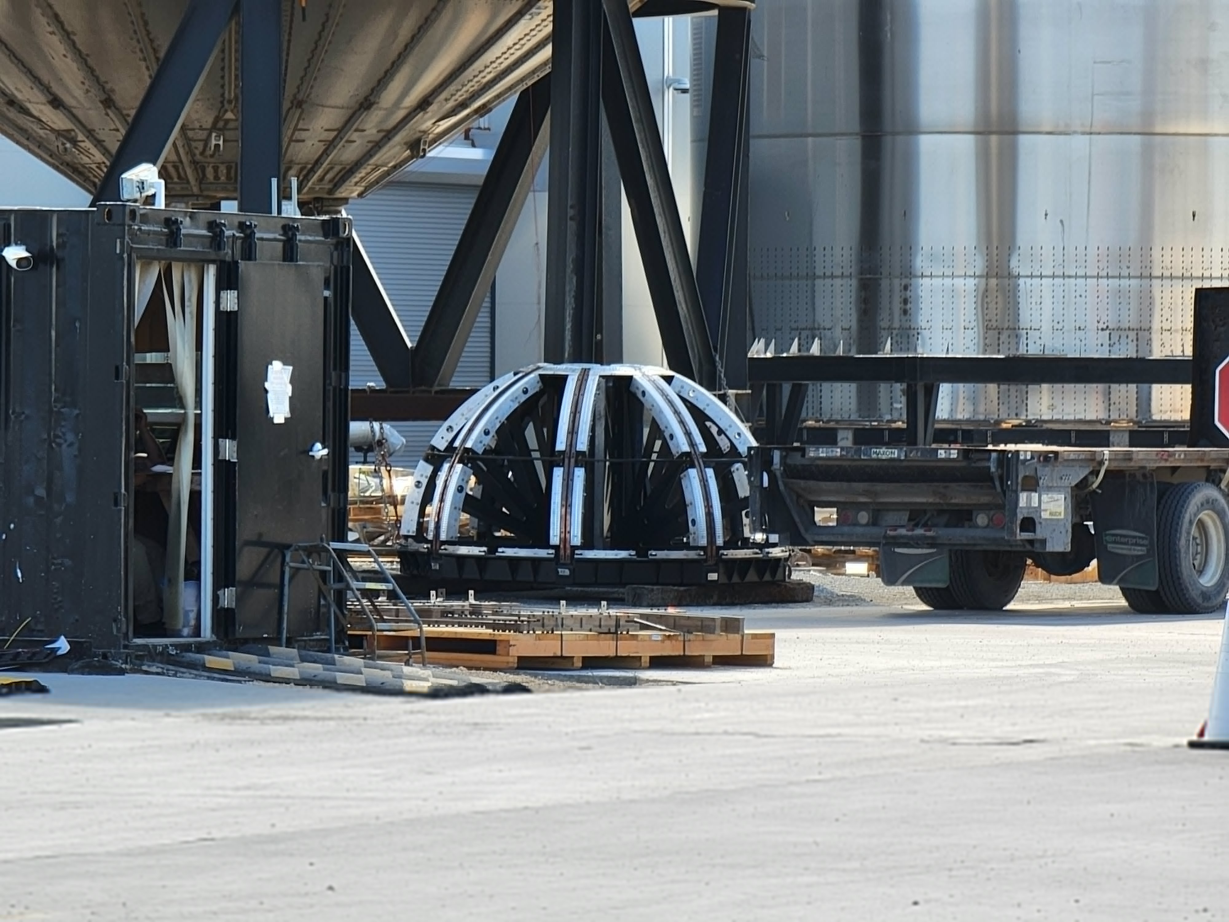 Первый бак наземной инфраструктуры орбитального стартового стола для криогенных компонентов топлива транспортируют с производственной площадки Starbase на пусковую. Он изготовлен по той же технологии, что и Starship с Super Heavy (большие кольца из листов нержавеющей стали), но в отличие от них покрыт теплоизоляцией / ©bocachicagal, NASASpaceFlight