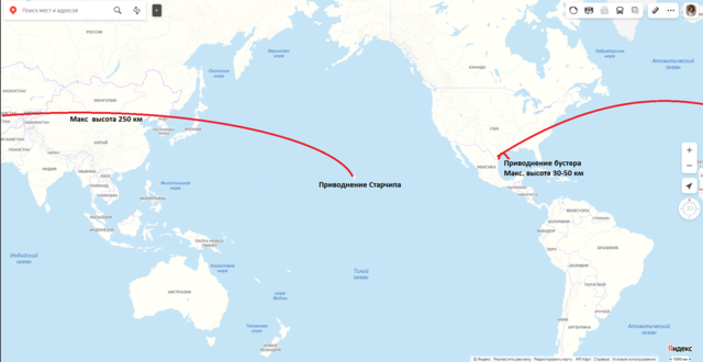 "Также в документе подтверждается посадка Super Heavy на воду в 33 км от места старта. Прототип корабля достигнет апогея орбиты в 250 км, прежде чем возвратится в атмосферу и попытается выполнить посадку на воду в 100 км к северо-западу от побережья острова Кауаи (Гавайи)."