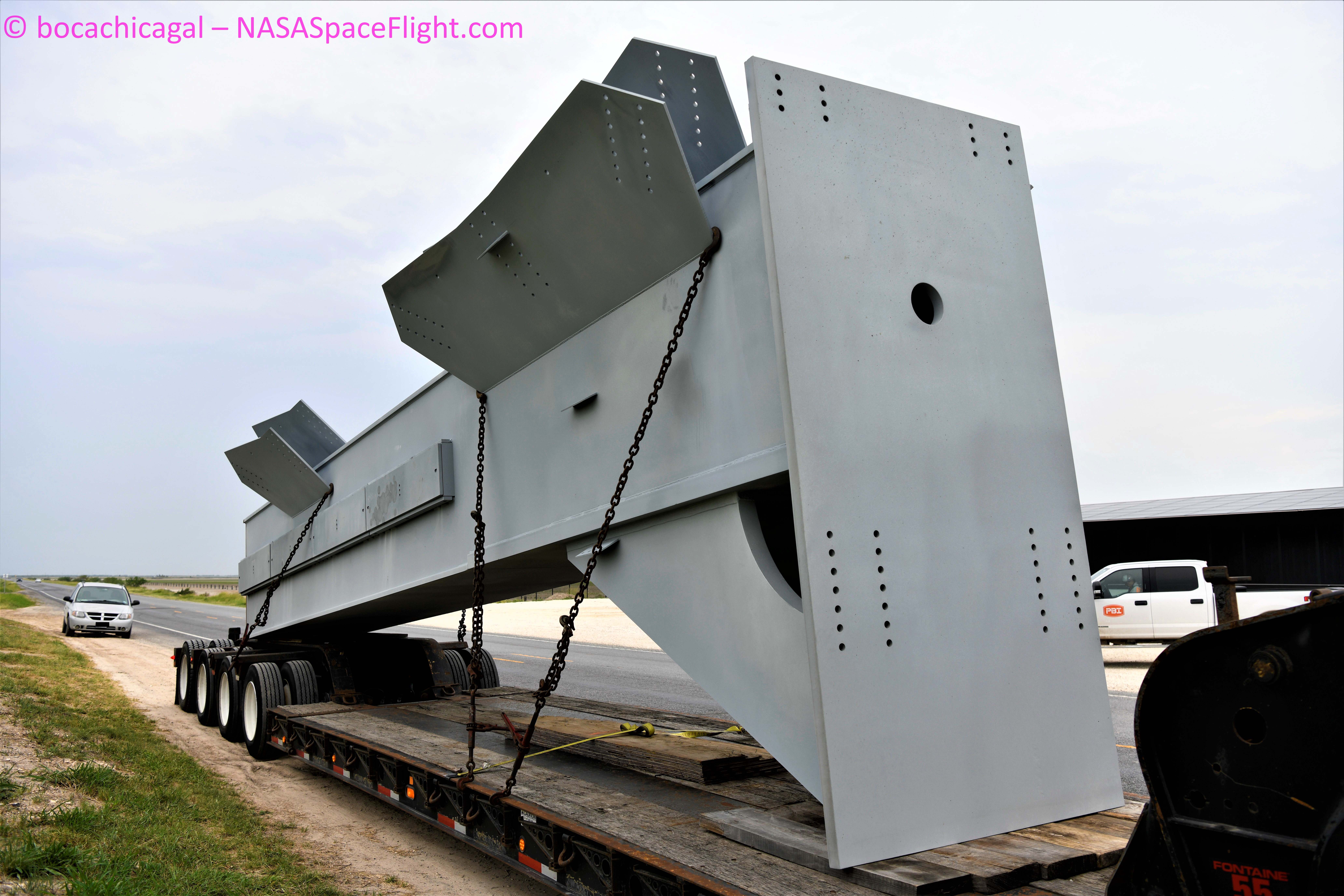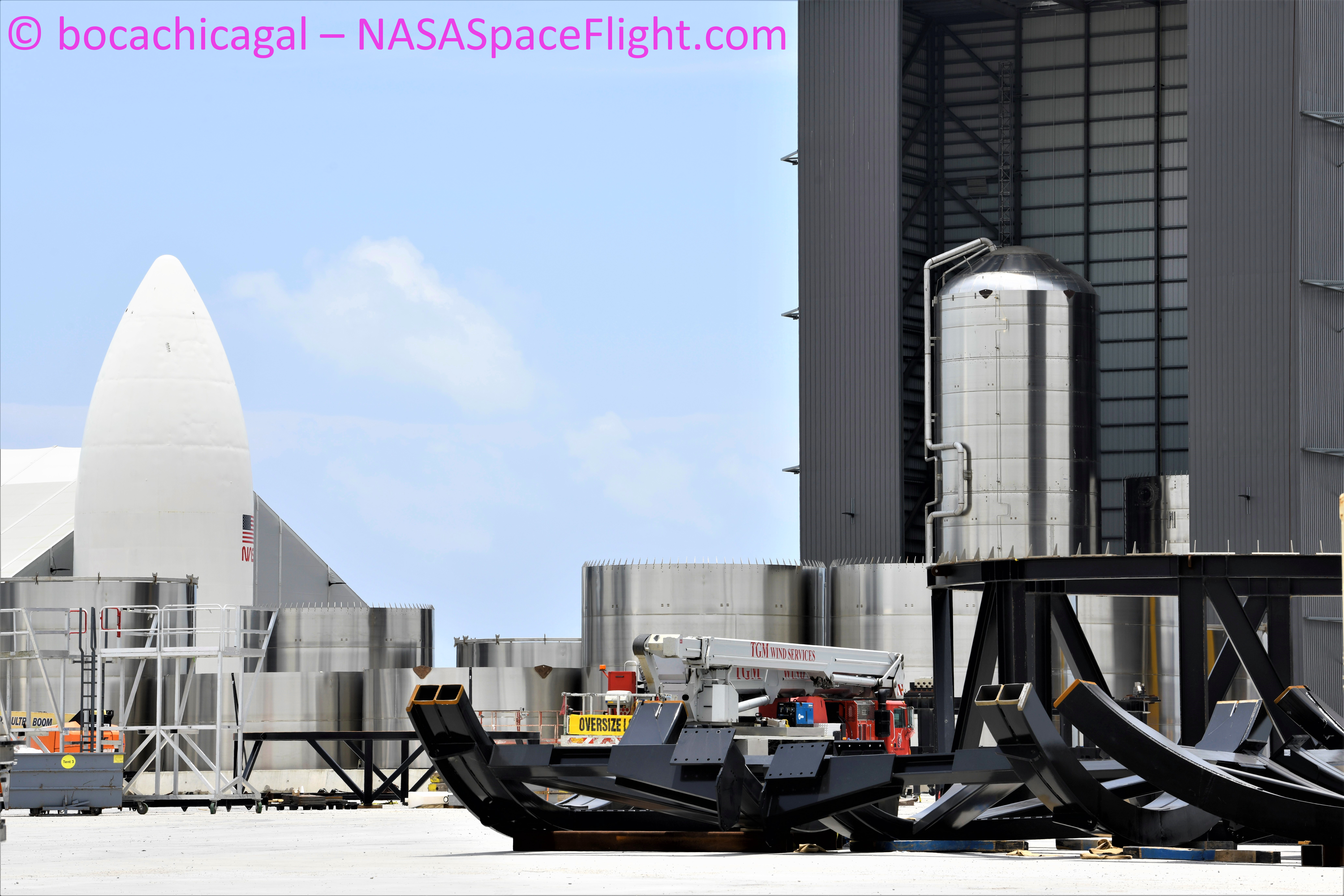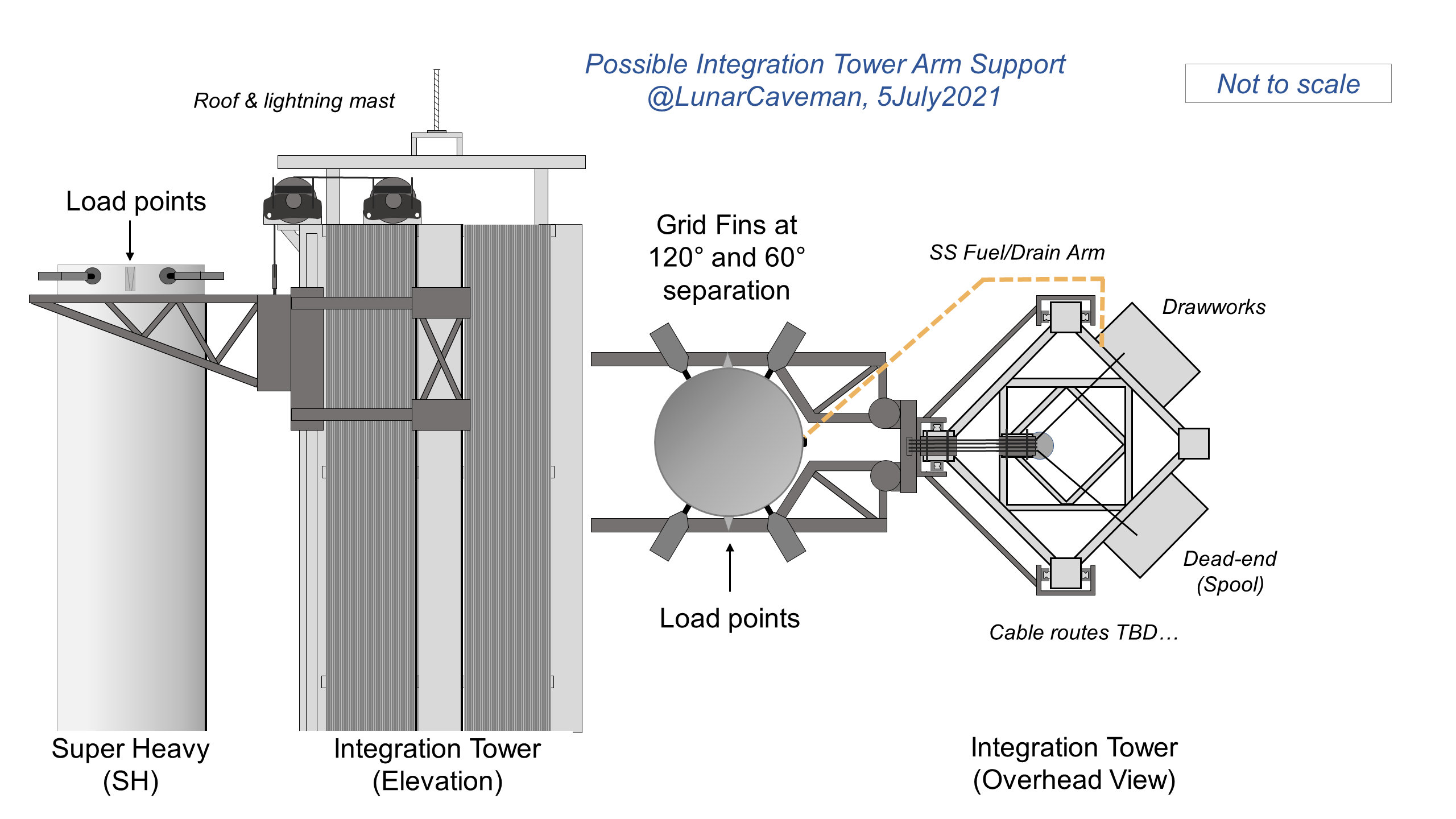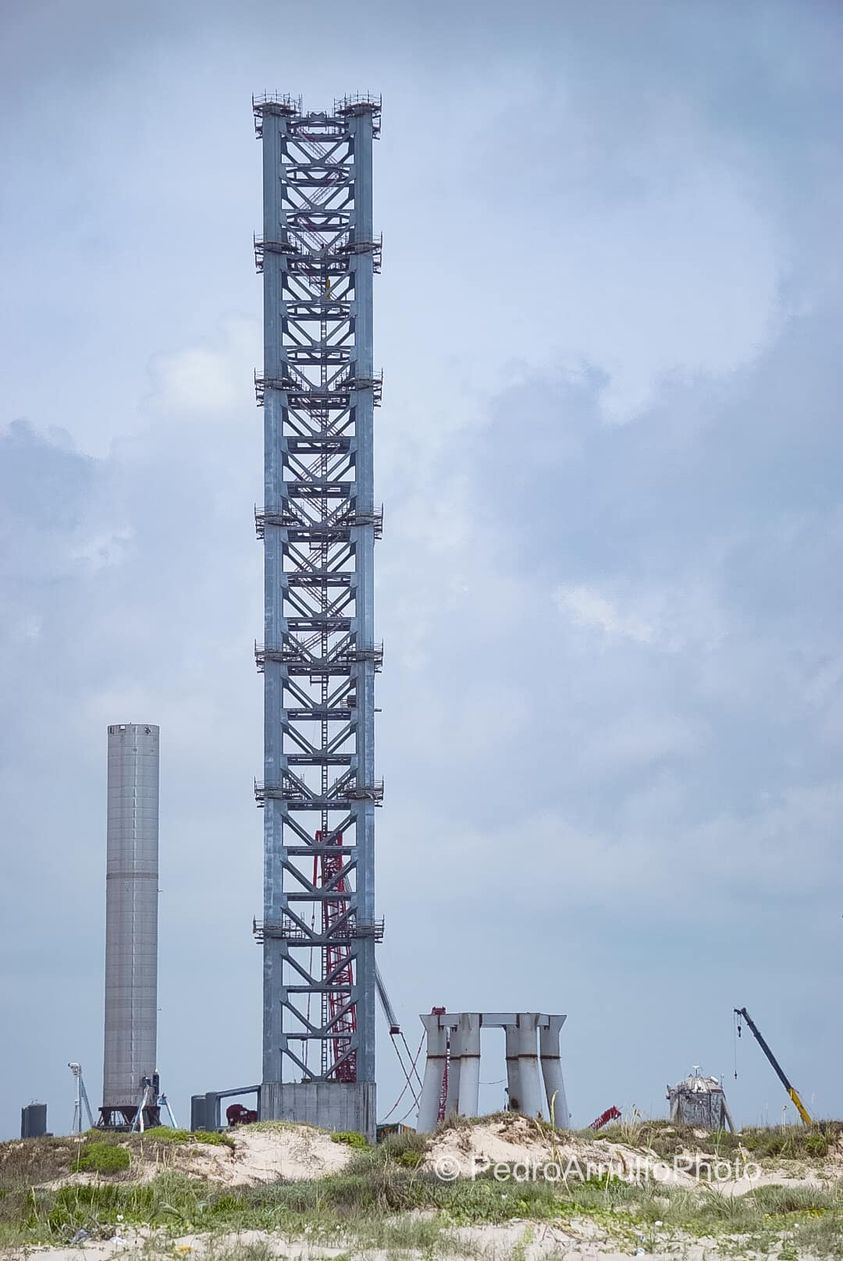 Интересная "спекуляция" - возможно на 4-ю колонну добавили площадку для крепления шкива. Хотя захваты вероятно будут другими. Про кран на вершине башни пока-что ничего не известно, возможно его и вовсе не будет.