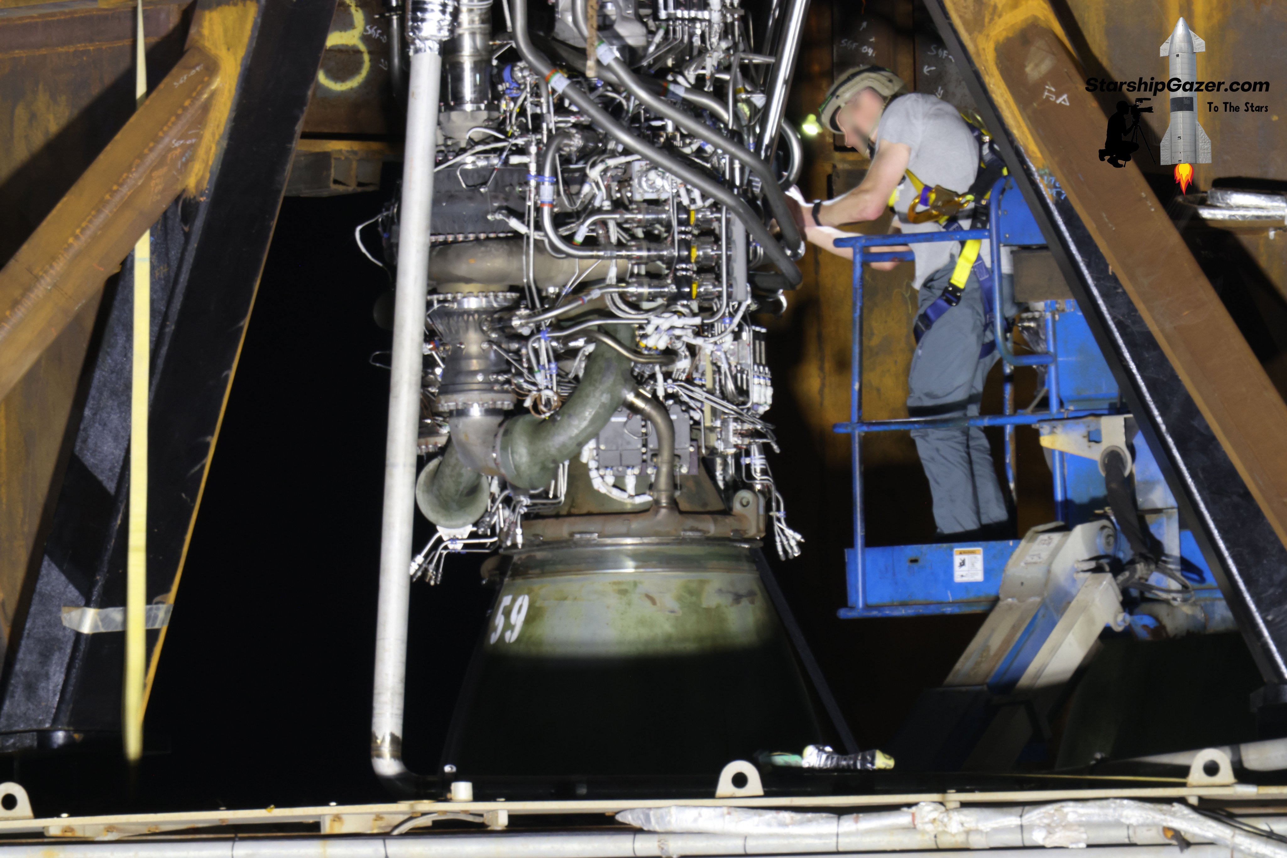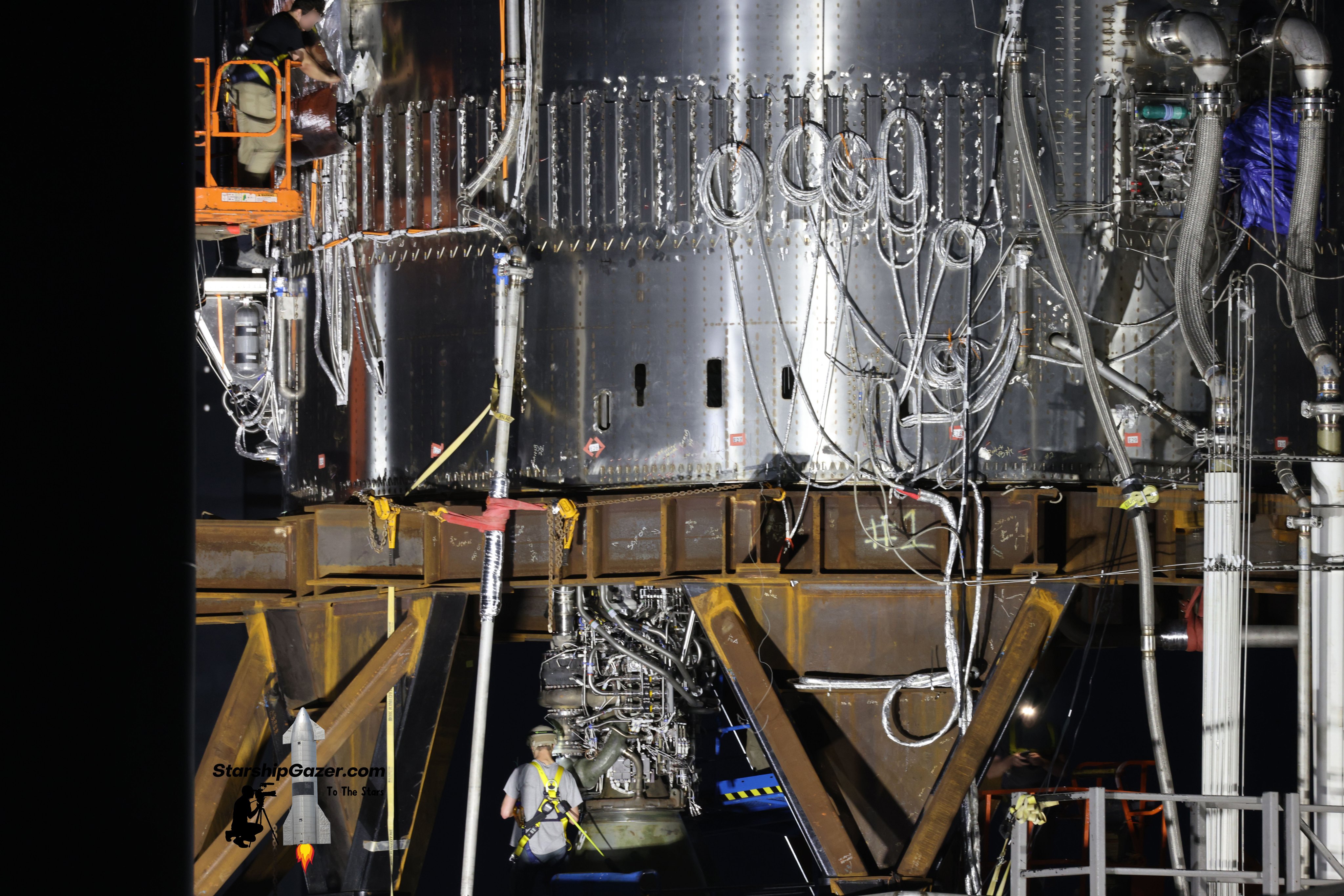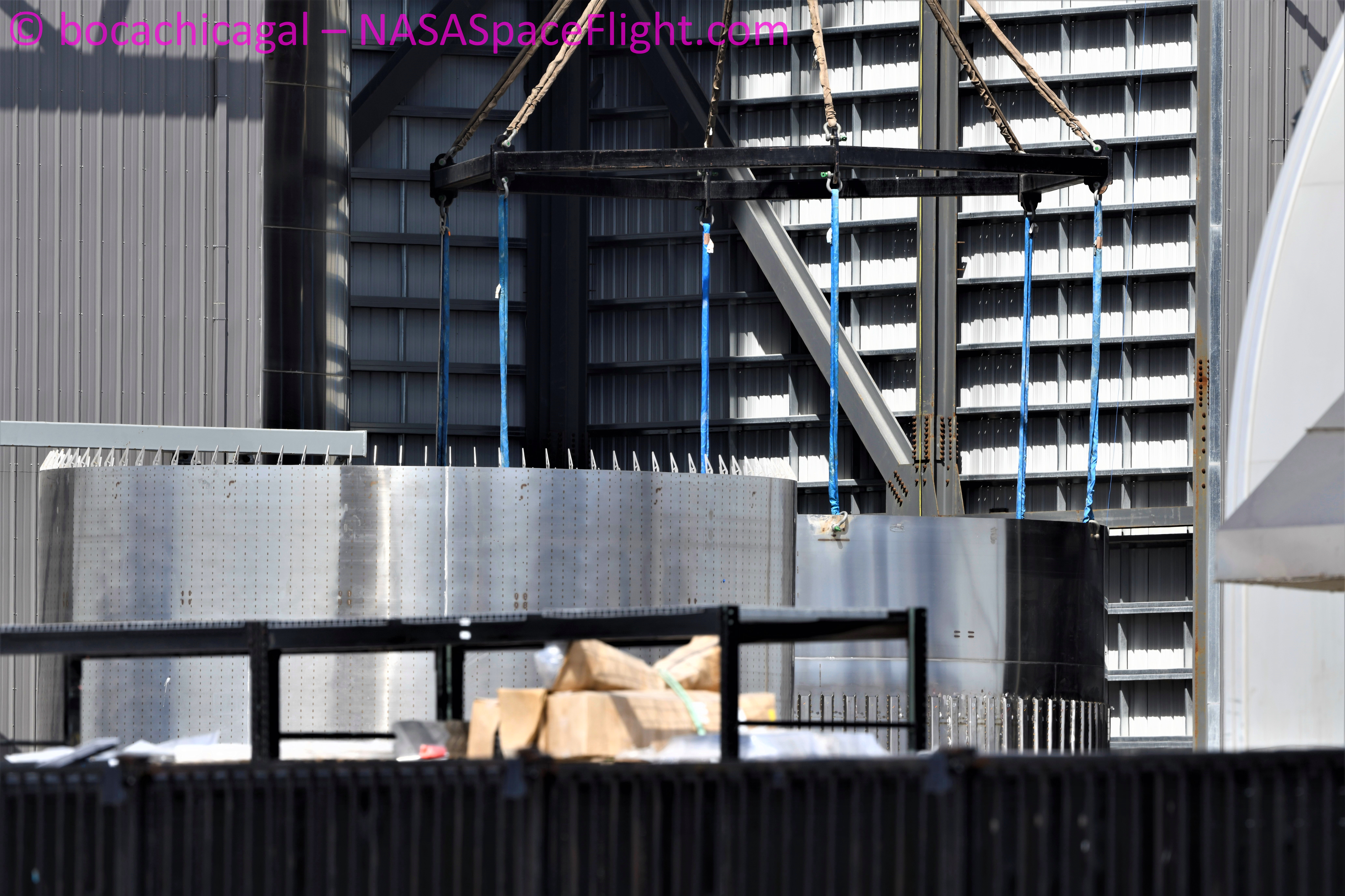 Похоже началась сборка верхнего бака B4 - секцию с общим днищем переместили в высокий ангар. Интересно, что на обечайке верхнего метанового бака нет следов от силового набора: