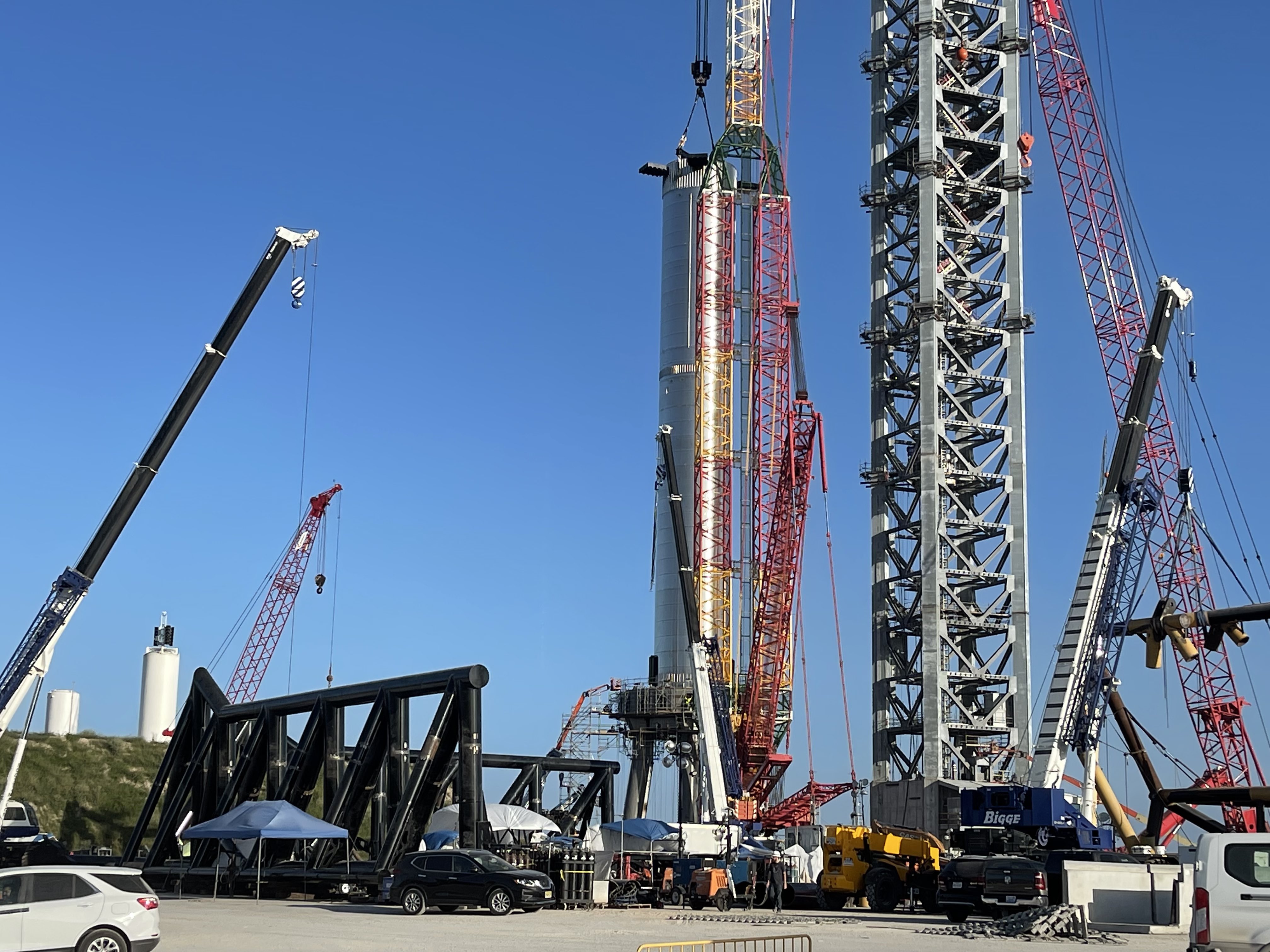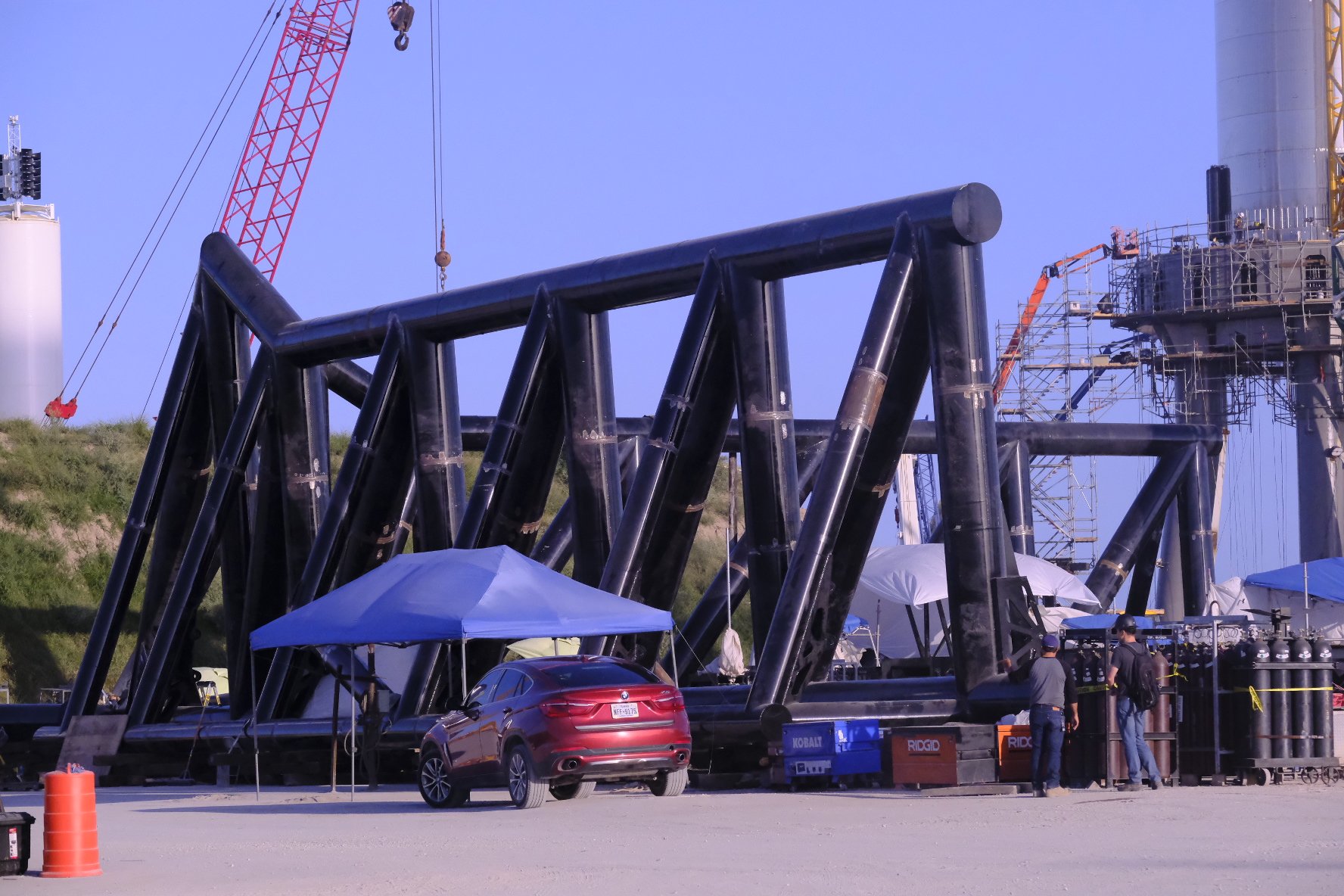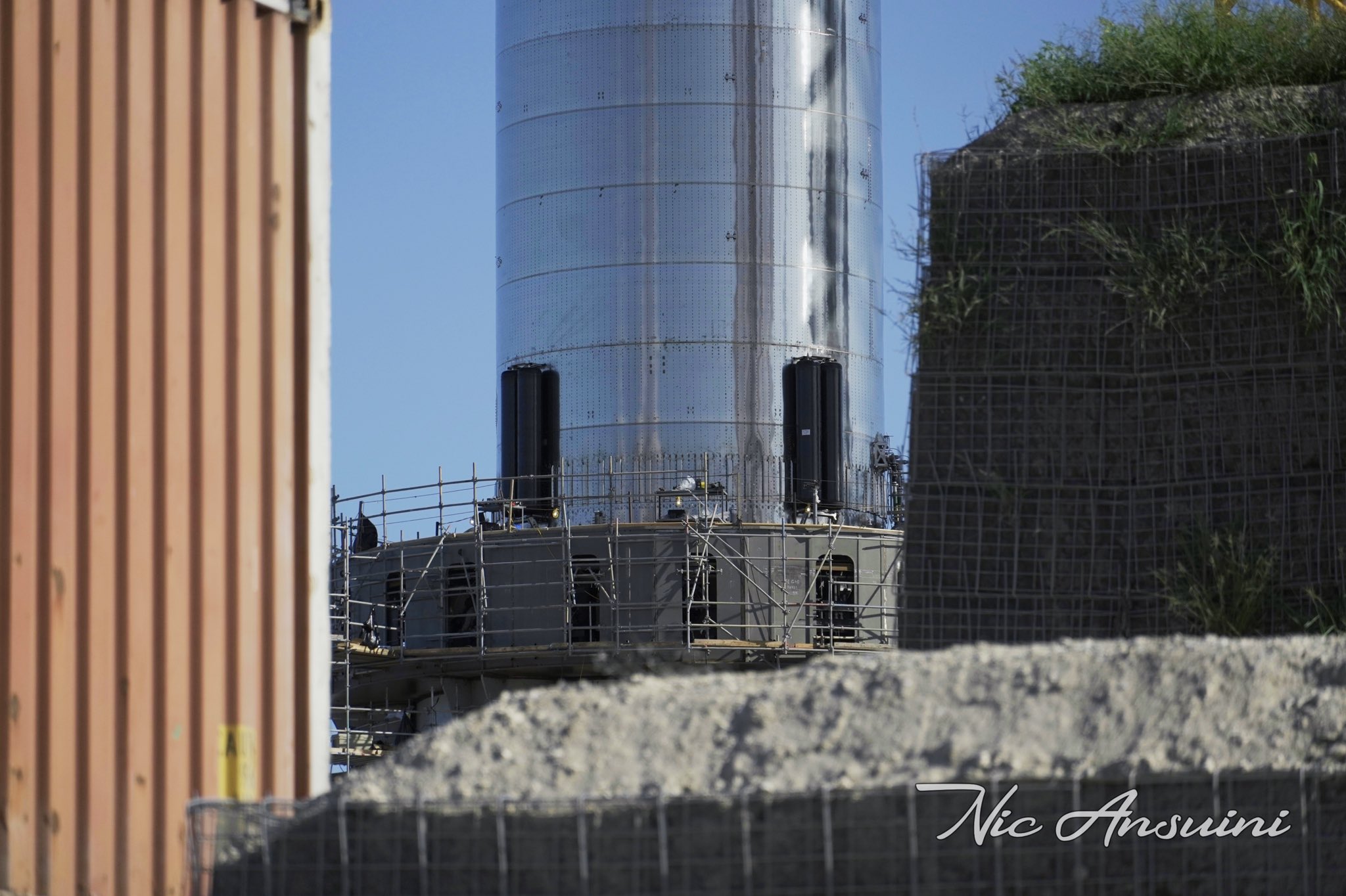 Это предположительно имитатор тяги для 9 центральных двигателей суперхеви. Просто собирают его рядом с SN15 и SN16. Имитатор тяги для внешнего кольца уже светился на фото. Ожидается криотест B4 с имитацией полной нагрузки от 29 двигателей.